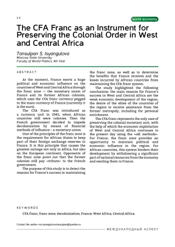 Франк КФА был введен в качестве денежной единицы в 1945 г., когда страны Западной и Центральной Африки еще были французскими колониями. Тогда французское правительство решило препятствовать деколонизации путем использования финансовых методов влияния – валютного союза.