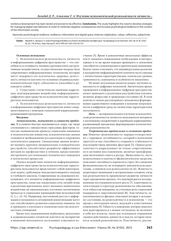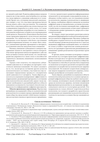 4. Белодед Д. Р. Ресурсы цифровой среды как инструмент информационно-психологического воздействия на молодежь // Актуальные проблемы психологии правоохранительной деятельности: концепции, подходы, технологии (Васильевские чтения — 2023) : мат-лы междунар. науч.-практ. конф., Санкт-Петербург, 20–21 апреля 2023 года / под ред. Ю. А. Шаранова, В. Л. Ситникова. СПб., 2023. С. 89–92.