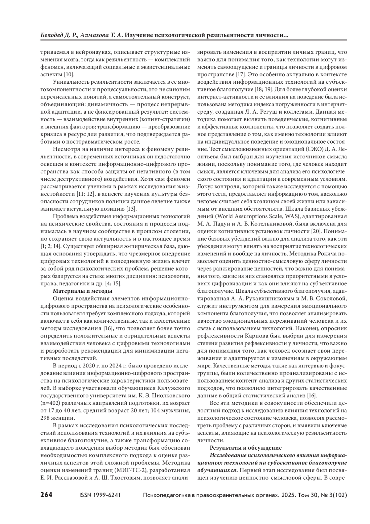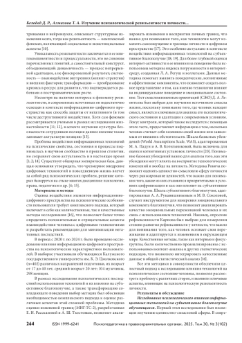 В условиях современного общества, где цифровые технологии становятся неотъемлемой частью жизни, необходимы понимание их влияния на психическое здоровье, поведение людей; оценка форм и содержания рисков негативного воздействия, способов защиты от него. Поэтому исследование влияния информационно-цифрового пространства на индивидуально-психологические особенности пользователей интернета, определяющих их психологическую резильентность, является актуальным. Цель — изучение психологической резильентности личности пользователя интернета к негативному воздействию и апробация коррекционно-развивающей программы формирования психологической резильентности. Материалы и методы. Использовались количественные и качественные методы, включая анкетирование и глубинное интервью. В выборке участвовали 402 человека. Были применены следующие методики: Индекс погруженности в интернетсреду (Л. А. Регуш и др.), Методика оценки изменений границ (МИГ-ТС-2) Е. И. Рассказовой, А. Ш. Тхостова, Тест смысложизненных ориентаций (СЖО) Д. А. Леонтьева, Шкала базисных убеждений (WAS) в адаптации М. А. Падун и А. В. Котельниковой, Шкала самоуважения М. Розенберга, а также статистические методы обработки данных. Результаты и обсуждение. Установлены высокие корреляционные связи между показателями, характеризующими вовлеченность в информационно-цифровое пространство, и локусом контроля понятия «жизнь», образом «Я», убеждением о контроле, субъективным благополучием, самоуважением, рефлексивностью и др. Апробирована коррекционно-развивающая программа развития психологической резильентности, которая показала свою эффективность. Выводы. Исследование подчеркивает необходимость разработки стратегий для управления цифровым поведением пользователей в целях минимизации негативных последствий и повышения психологической резильентности в условиях информационного общества.