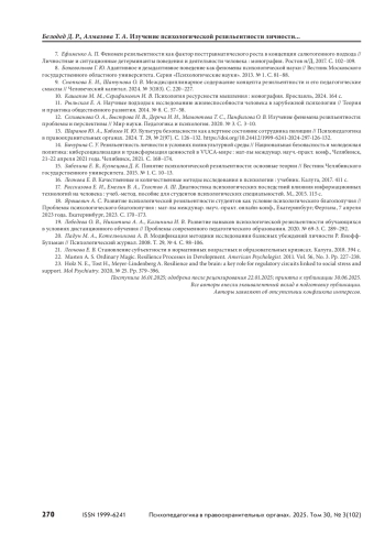5. Буланова И. С., Двойнин А. М., Двойнина В. К. Представления об устойчивости в концептуальном пространстве психологии // Современная зарубежная психология. 2025. Т. 14, № 1. С. 103–113.