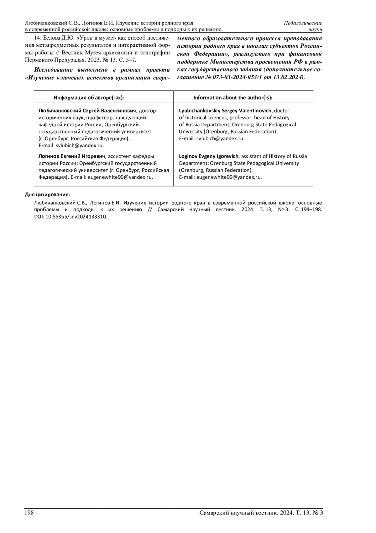 14. Белова Д.Ю. “Урок в музее” как способ достижения метапредметных результатов и интерактивной формы работы // Вестник Музея археологии и этнографии Пермского Предуралья. 2023. № 13. С. 5-7. EDN: GRTGKL