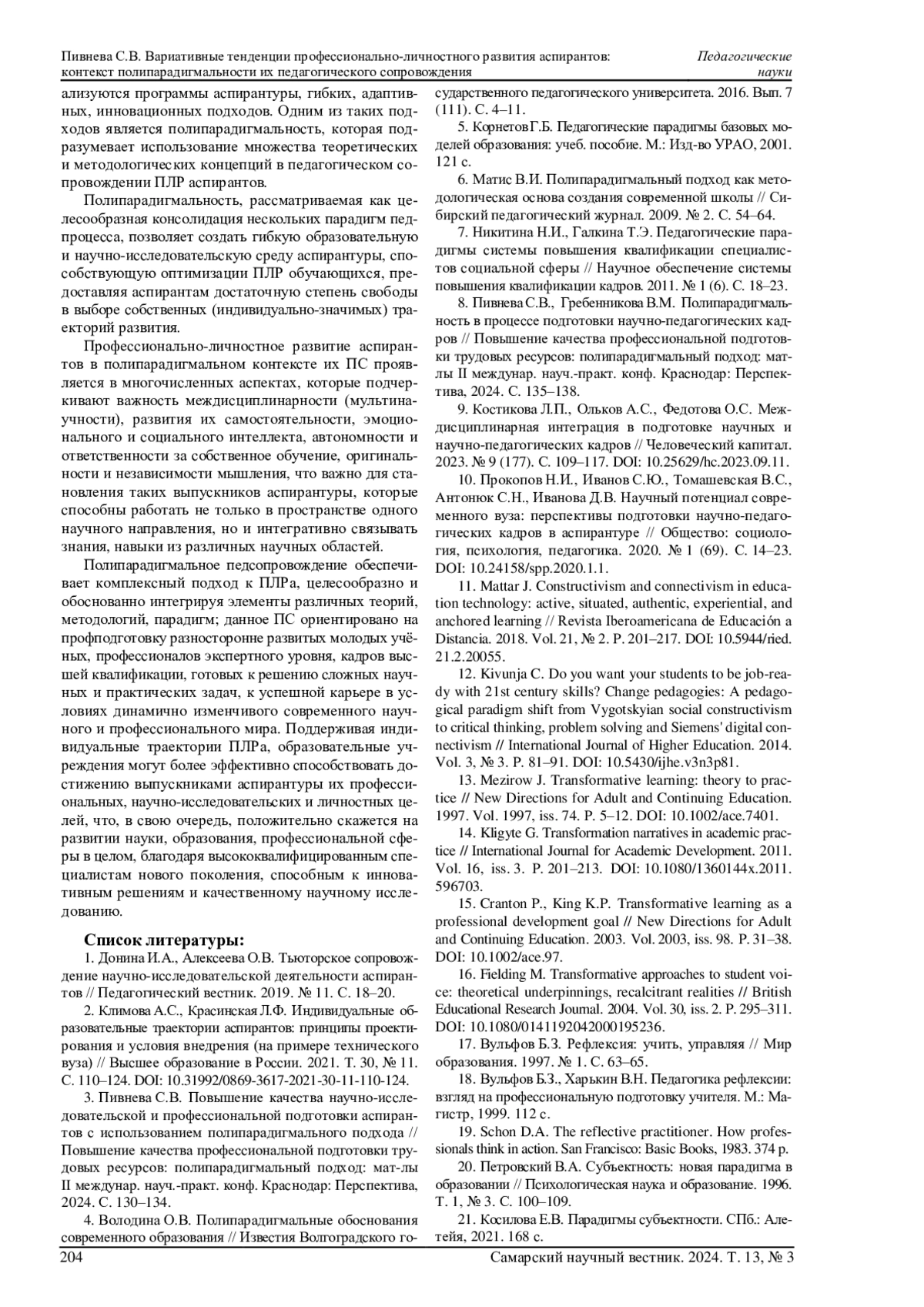 8. Пивнева С.В., Гребенникова В.М. Полипарадигмальность в процессе подготовки научно-педагогических кадров // Повышение качества профессиональной подготовки трудовых ресурсов: полипарадигмальный подход: мат-лы II междунар. науч.-практ. конф. Краснодар: Перспектива, 2024. С. 135-138. EDN: POTEZU