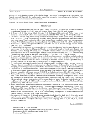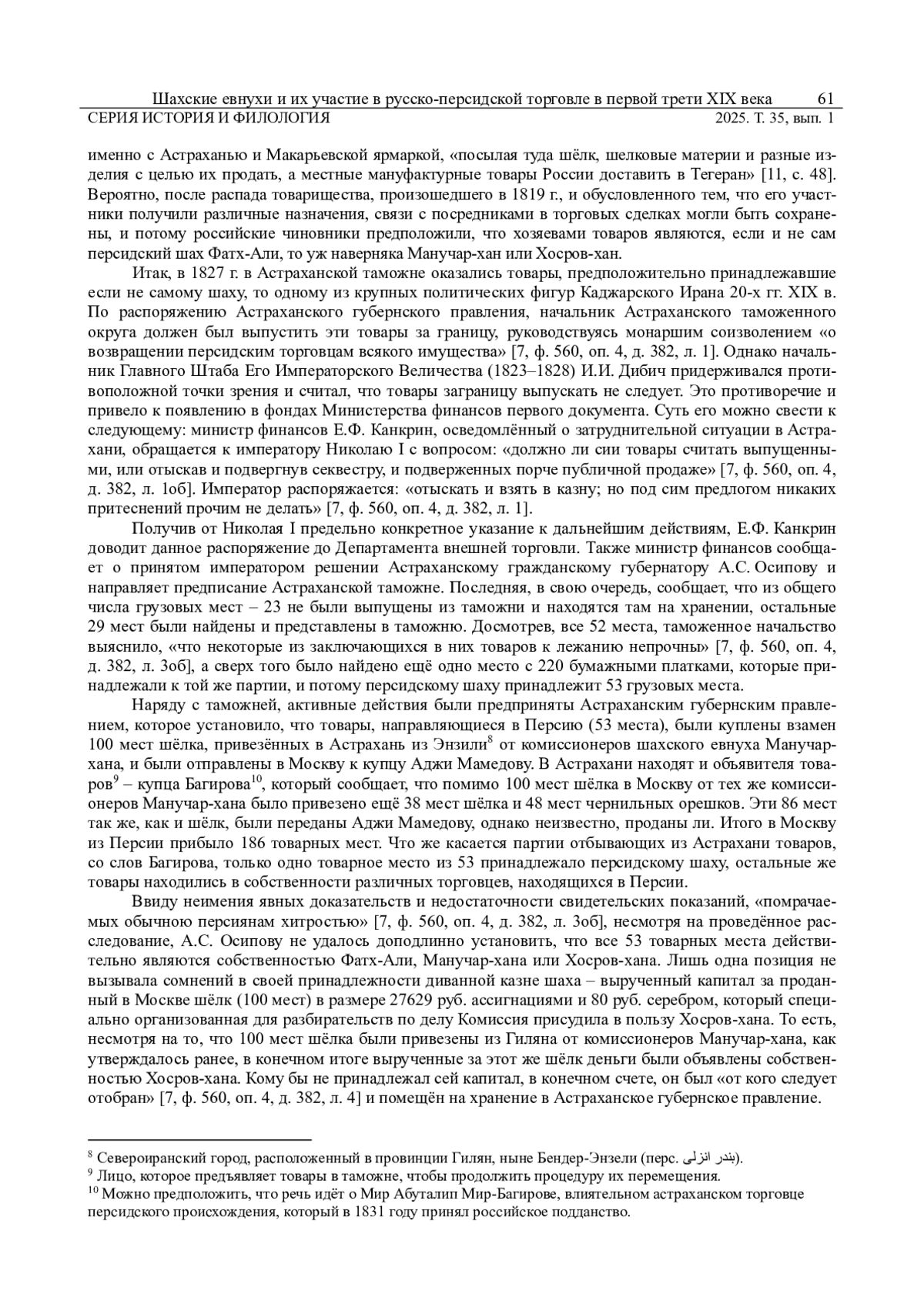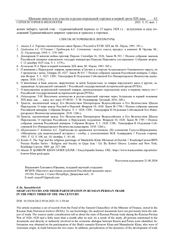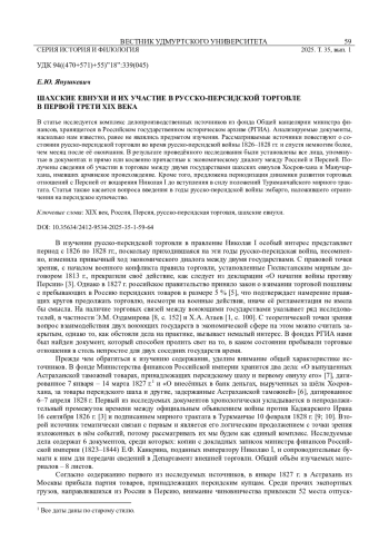 В статье исследуется комплекс делопроизводственных источников из фонда Общей канцелярии министра финансов, хранящегося в Российском государственном историческом архиве (РГИА). Анализируемые документы, насколько нам известно, ранее не являлись предметом изучения. Рассматриваемые источники повествуют о состоянии русско-персидской торговли во время русско-персидской войны 1826-1828 гг. и спустя немногим более, чем месяц после её окончания. В результате проведённого исследования были установлены все лица, упомянутые в документах и прямо или косвенно причастные к экономическому диалогу между Россией и Персией. Получены сведения об участии в торговле между двумя государствами шахских евнухов Хосров-хана и Манучар-хана, имевших армянское происхождение. Кроме того, предложена периодизация динамики развития торговых отношений с Персией от воцарения Николая I до вступления в силу положений Туркманчайского мирного трактата. Статья также касается вопроса введения в годы русско-персидской войны эмбарго, наложившего ограничения на персидское купечество.