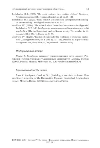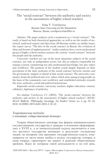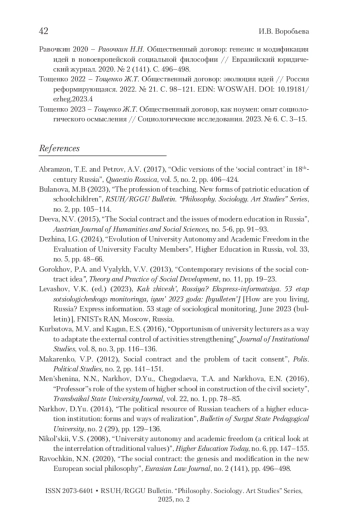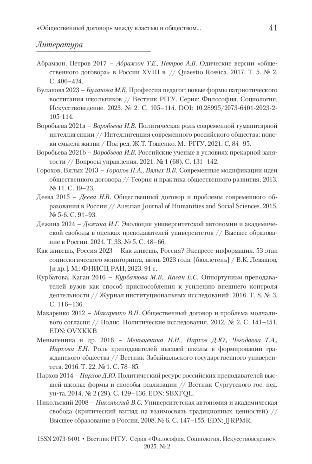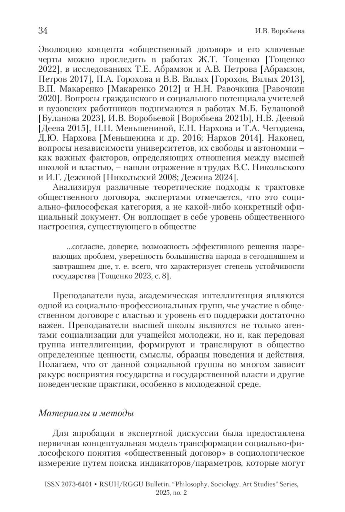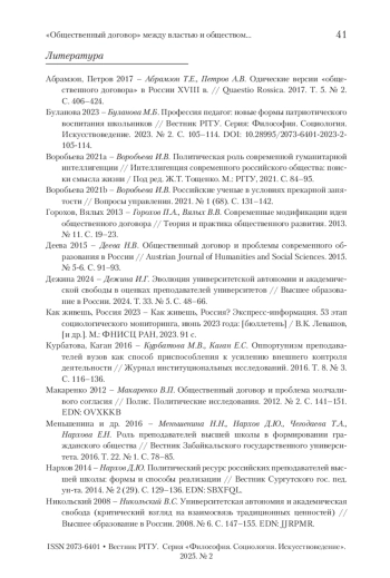 ВОРОБЬЕВА И. В. «ОБЩЕСТВЕННЫЙ ДОГОВОР» МЕЖДУ ВЛАСТЬЮ И ОБЩЕСТВОМ В ОЦЕНКАХ ПРЕПОДАВАТЕЛЕЙ ВЫСШЕЙ ШКОЛЫ // ВЕСТНИК РГГУ. СЕРИЯ: ФИЛОСОФИЯ. СОЦИОЛОГИЯ. ИСКУССТВОВЕДЕНИЕ. 2025. № 2