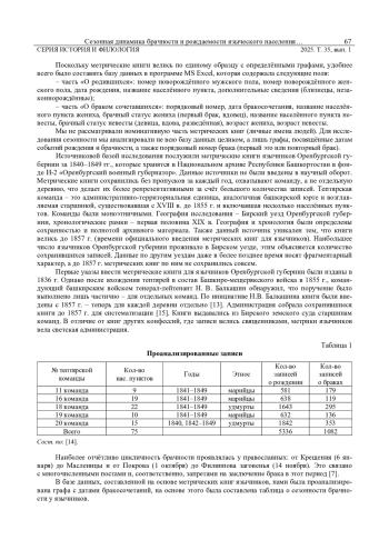 Статья: СЕЗОННАЯ ДИНАМИКА БРАЧНОСТИ И РОЖДАЕМОСТИ ЯЗЫЧЕСКОГО НАСЕЛЕНИЯ ОРЕНБУРГСКОЙ ГУБЕРНИИ В ПЕРВОЙ ПОЛОВИНЕ XIX ВЕКА ПО МАТЕРИАЛАМ МЕТРИЧЕСКИХ КНИГ (2025)