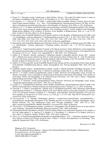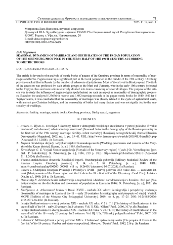 МИГРАНОВА Д. Н. СЕЗОННАЯ ДИНАМИКА БРАЧНОСТИ И РОЖДАЕМОСТИ ЯЗЫЧЕСКОГО НАСЕЛЕНИЯ ОРЕНБУРГСКОЙ ГУБЕРНИИ В ПЕРВОЙ ПОЛОВИНЕ XIX ВЕКА ПО МАТЕРИАЛАМ МЕТРИЧЕСКИХ КНИГ // ВЕСТНИК УДМУРТСКОГО УНИВЕРСИТЕТА. СЕРИЯ: ИСТОРИЯ И ФИЛОЛОГИЯ. 2025. Т. 35 № 1