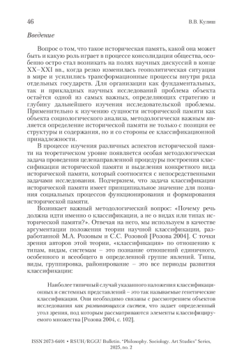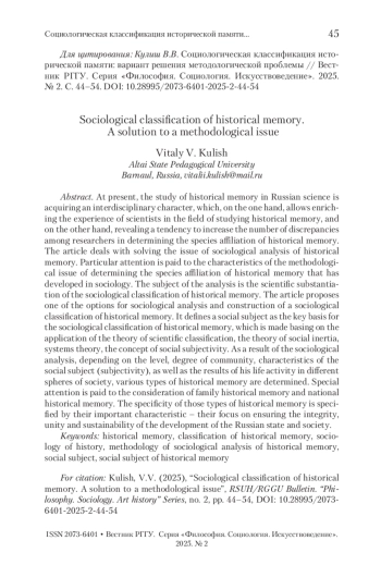 В настоящее время исследование исторической памяти в отечественной науке приобретает междисциплинарный характер, что, с одной стороны, позволяет обогатить опыт ученых в области изучения исторической памяти, с другой стороны, выявить тенденцию увеличения количества разночтений исследователей в определении видовой принадлежности исторической памяти. Статья посвящена решению проблемы социологического анализа исторической памяти. Особое внимание уделяется характеристике сложившейся в социологии методологической проблеме определения видовой принадлежности исторической памяти. Предметом анализа выступает научное обоснование социологической классификации исторической памяти. Предлагается один из вариантов социологического анализа и построения социологической классификации исторической памяти. В статье на основе применения теории научной классификации, теории социальной инерции, теории систем, концепции социальной субъектности в качестве ключевого основания социологической классификации исторической памяти определяется социальный субъект. В результате проведенного социологического анализа в зависимости от уровня, степени общности, характеристик социального субъекта (субъектности), а также результатов его жизнедеятельности в разных сферах общества определяются разные виды исторической памяти. Отдельное внимание уделяется рассмотрению семейной исторической памяти и общенациональной исторической памяти. Специфичность этих видов исторической памяти определена их важной характеристикой – направленность на обеспечение целостности, единства и устойчивости развития российского государства и общества.