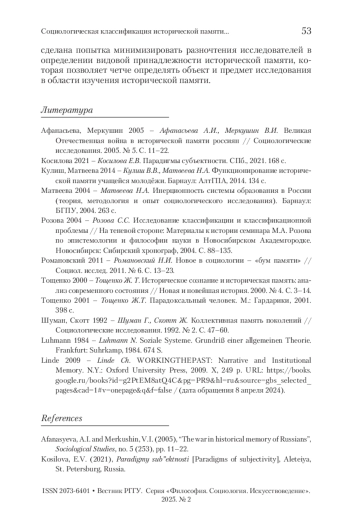 1. Афанасьева, Меркушин 2005 - Афанасьева А.И., Меркушин В.И. Великая Отечественная война в исторической памяти россиян // Социологические исследования. 2005. № 5. С. 11-22.