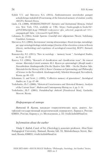 3. Кулиш, Матвеева 2014 - Кулиш В.В., Матвеева Н.А. Функционирование исторической памяти учащейся молодёжи. Барнаул: АлтГПА, 2014. 134 с.