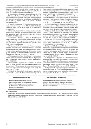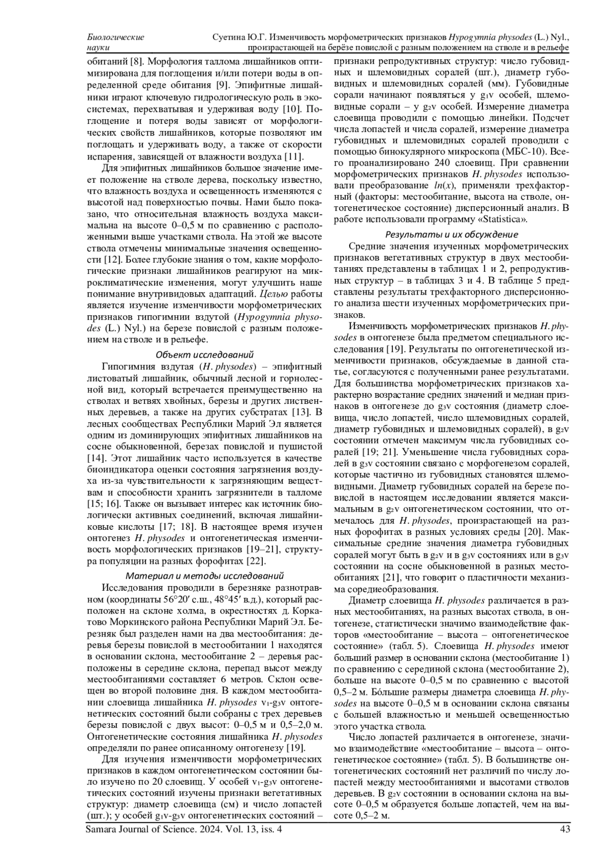 СУЕТИНА Ю. Г. ИЗМЕНЧИВОСТЬ МОРФОМЕТРИЧЕСКИХ ПРИЗНАКОВ HYPOGYMNIA PHYSODES (L.) NYL., ПРОИЗРАСТАЮЩЕЙ НА БЕРЁЗЕ ПОВИСЛОЙ С РАЗНЫМ ПОЛОЖЕНИЕМ НА СТВОЛЕ И В РЕЛЬЕФЕ // САМАРСКИЙ НАУЧНЫЙ ВЕСТНИК. 2024. ТОМ 13, № 4