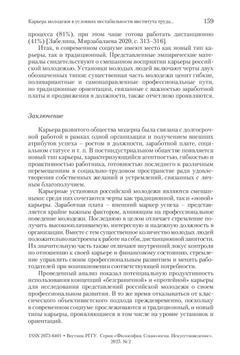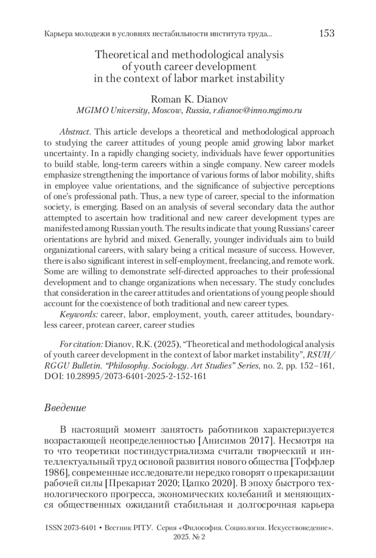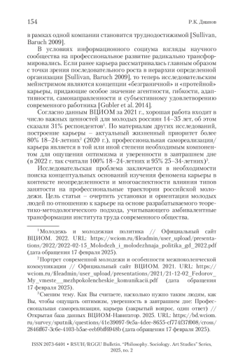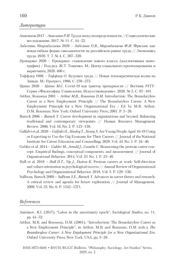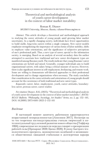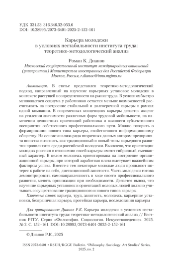 ДИАНОВ Р. К. КАРЬЕРА МОЛОДЕЖИ В УСЛОВИЯХ НЕСТАБИЛЬНОСТИ ИНСТИТУТА ТРУДА: ТЕОРЕТИКО-МЕТОДОЛОГИЧЕСКИЙ АНАЛИЗ // ВЕСТНИК РГГУ. СЕРИЯ: ФИЛОСОФИЯ. СОЦИОЛОГИЯ. ИСКУССТВОВЕДЕНИЕ. 2025. № 2