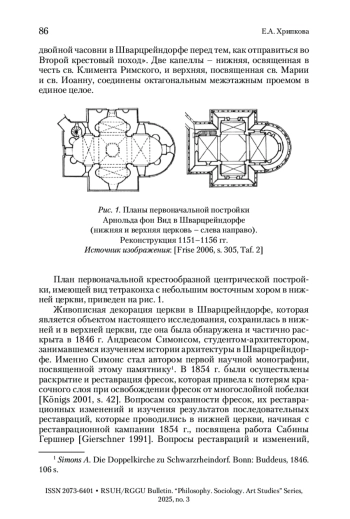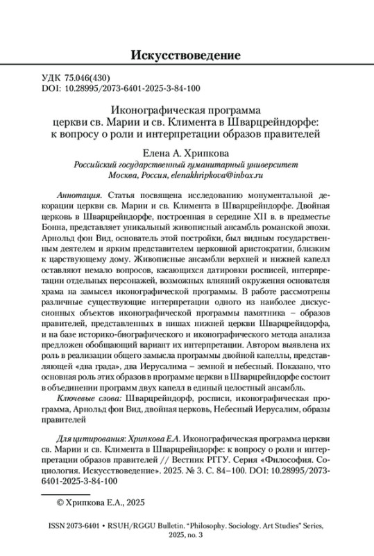Статья посвящена исследованию монументальной декорации церкви св. Марии и св. Климента в Шварцрейндорфе. Двойная церковь в Шварцрейндорфе, построенная в середине XII в. в предместье Бонна, представляет уникальный живописный ансамбль романской эпохи. Арнольд фон Вид, основатель этой постройки, был видным государственным деятелем и ярким представителем церковной аристократии, близким к царствующему дому. Живописные ансамбли верхней и нижней капелл оставляют немало вопросов, касающихся датировки росписей, интерпретации отдельных персонажей, возможных влияний окружения основателя храма на замысел иконографической программы. В работе рассмотрены различные существующие интерпретации одного из наиболее дискуссионных объектов иконографической программы памятника – образов правителей, представленных в нишах нижней церкви Шварцрейндорфа, и на базе историко-биографического и иконографического метода анализа предложен обобщающий вариант их интерпретации. Автором выявлена их роль в реализации общего замысла программы двойной капеллы, представляющей «два града», два Иерусалима – земной и небесный. Показано, что основная роль этих образов в программе церкви в Шварцрейндорфе состоит в объединении программ двух капелл в единый целостный ансамбль.