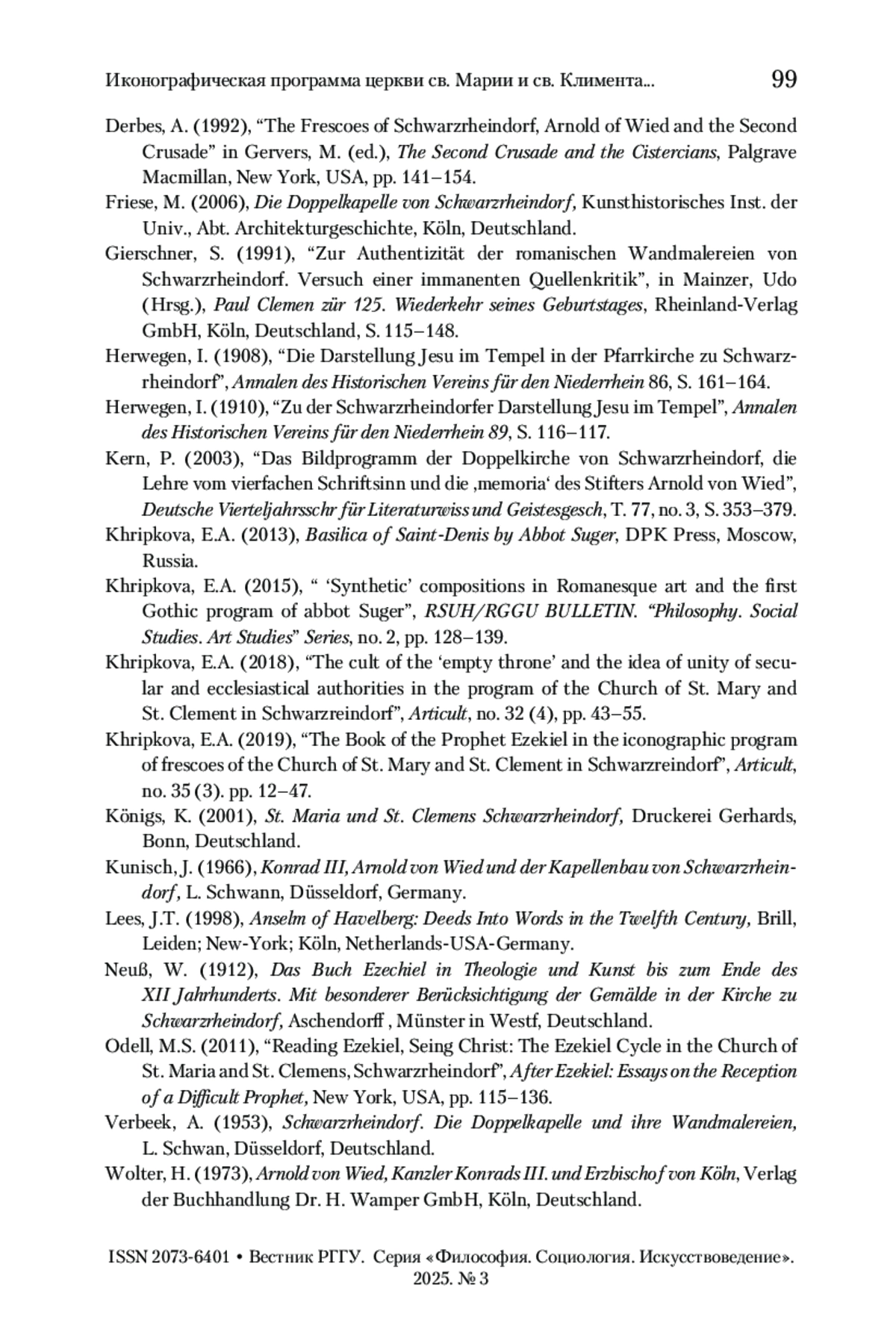 12. Kern 2003 - Kern P. Das Bildprogramm der Doppelkirche von Schwarzrheindorf, die Lehre vom vierfachen Schriftsinn und die ‚memoria‘ des Stifters Arnold von Wied // Deutsche Vierteljahrsschr für Literaturwiss und Geistesgesch. 2003. Т. 77. No. 3. S. 353-379.