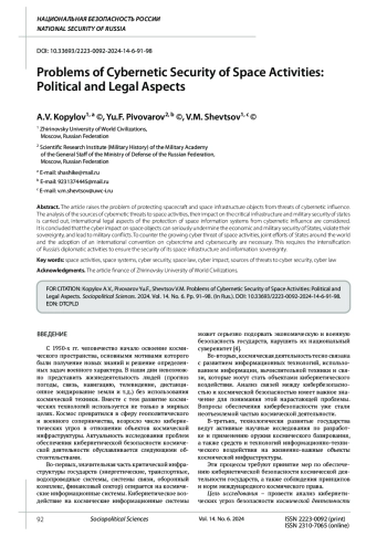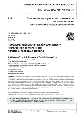 В статье поставлена проблема защиты космических аппаратов и объектов космической инфраструктуры от угроз кибернетического воздействия. Проведен анализ источников кибернетических угроз космической деятельности, их влияния на критически важную инфраструктуру и военную безопасность государств, рассмотрены международно-правовые аспекты защиты космических информационных систем от кибернетического воздействия. Сделан вывод о том, что кибернетическое воздействие на космические объекты может серьезно подорвать экономическую и военную безопасность государств, нарушить их суверенитет, привести к военным конфликтам. Для парирования нарастающей кибернетической угрозы космической деятельности необходимы общие усилия государств всего мира, принятие международной конвенции о киберпреступности и кибербезопасности. Это требует активизации дипломатической деятельности России по обеспечению безопасности ее космической инфраструктуры и информационного суверенитета.