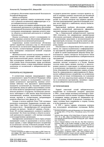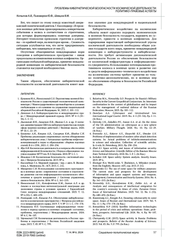 10. Розенцвайг А.И., Коныгин Р.А. Обеспечение кибербезопасности в космическом пространстве // Вопросы российского и международного права. 2019. Т. 9. № 11-1. С. 170-178. EDN: GQBVOH