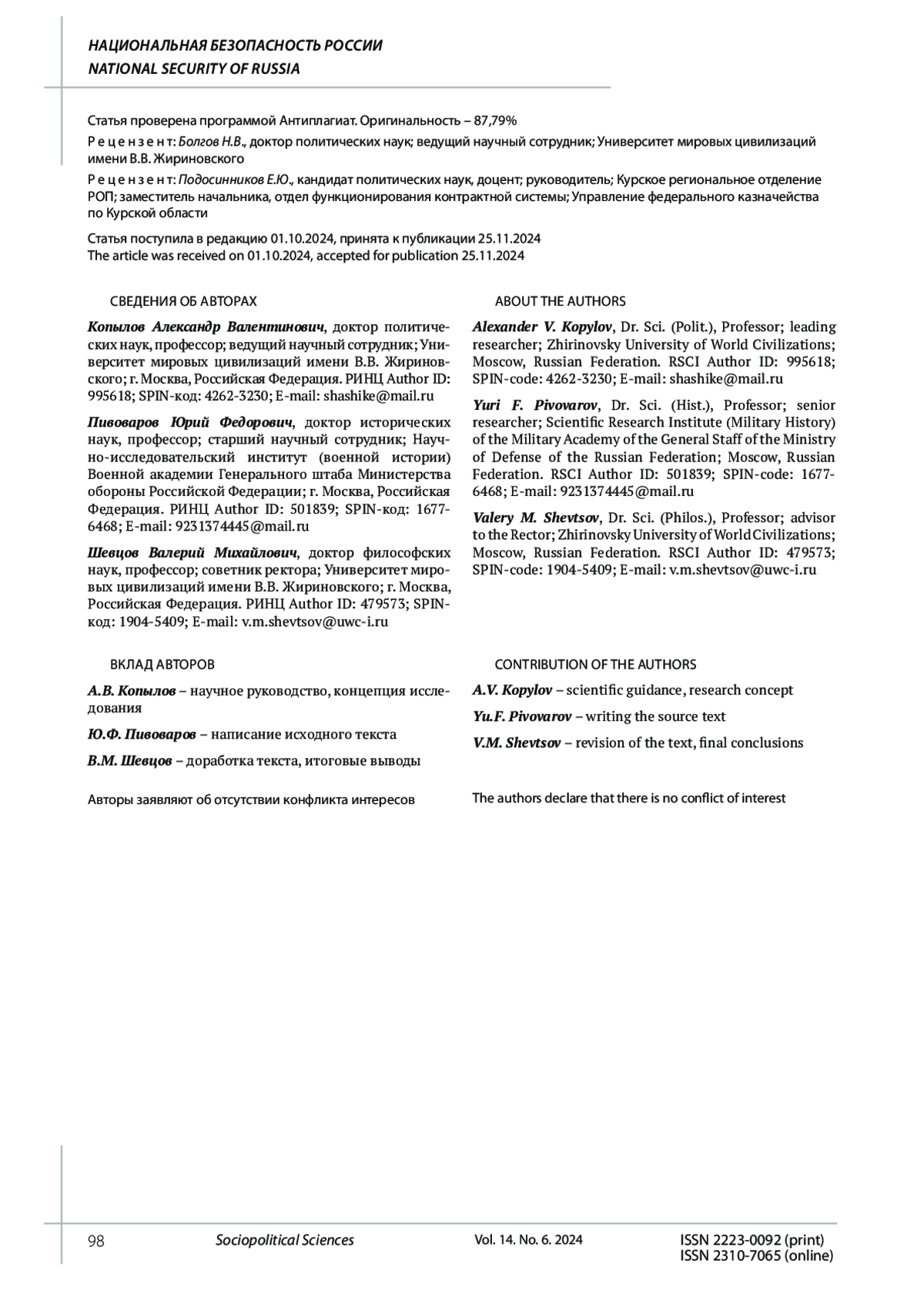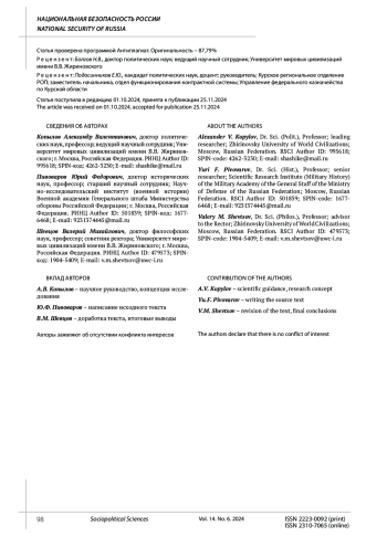 Bulavina M.A., Novoselsky S.O. Prospects for Russia’s Military Security in the Current Geopolitical Conjuncture. In: Interstate confrontation in the context of globalization and its impact on the management of national defense of the Russian Federation. Moscow, 2023. Pp. 105-112.