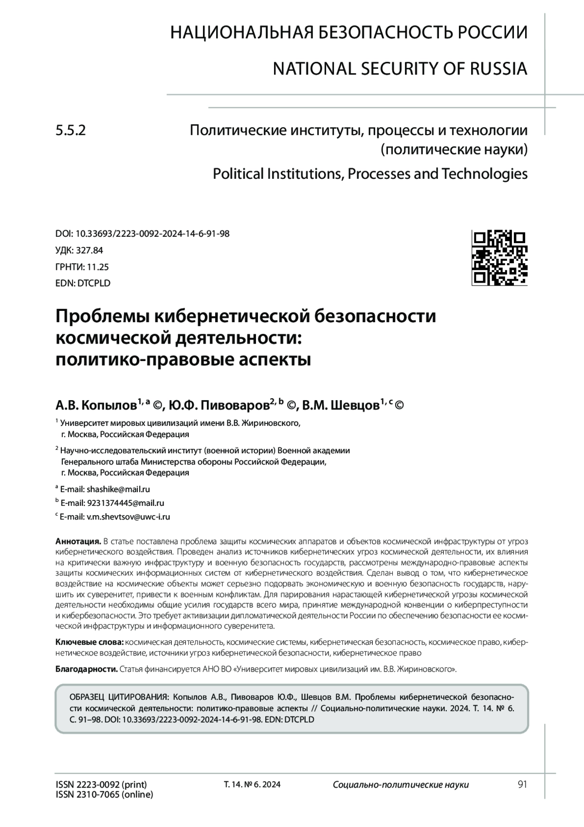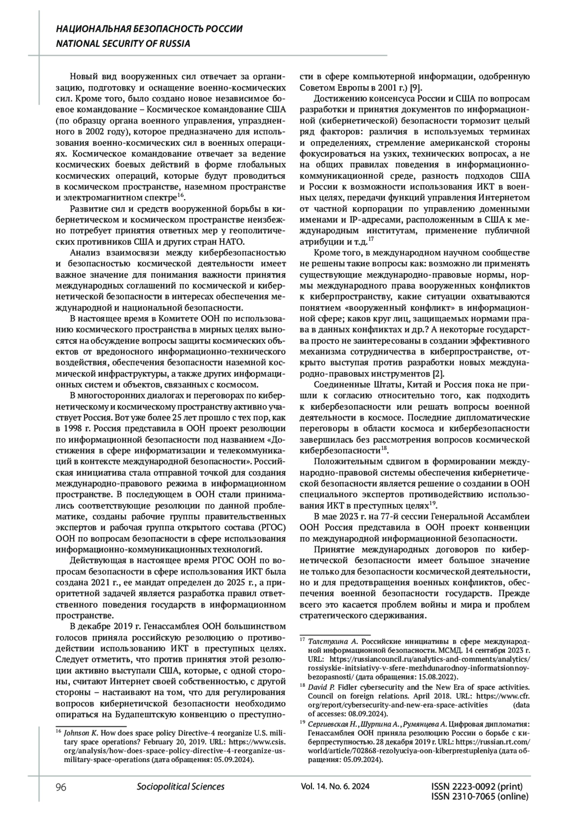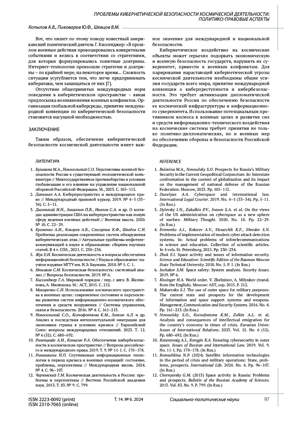 6. Иншаков С.М. Космическая безопасность: системный анализ // Вопросы безопасности. 2019. № 6. EDN: ERUVID