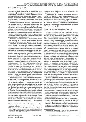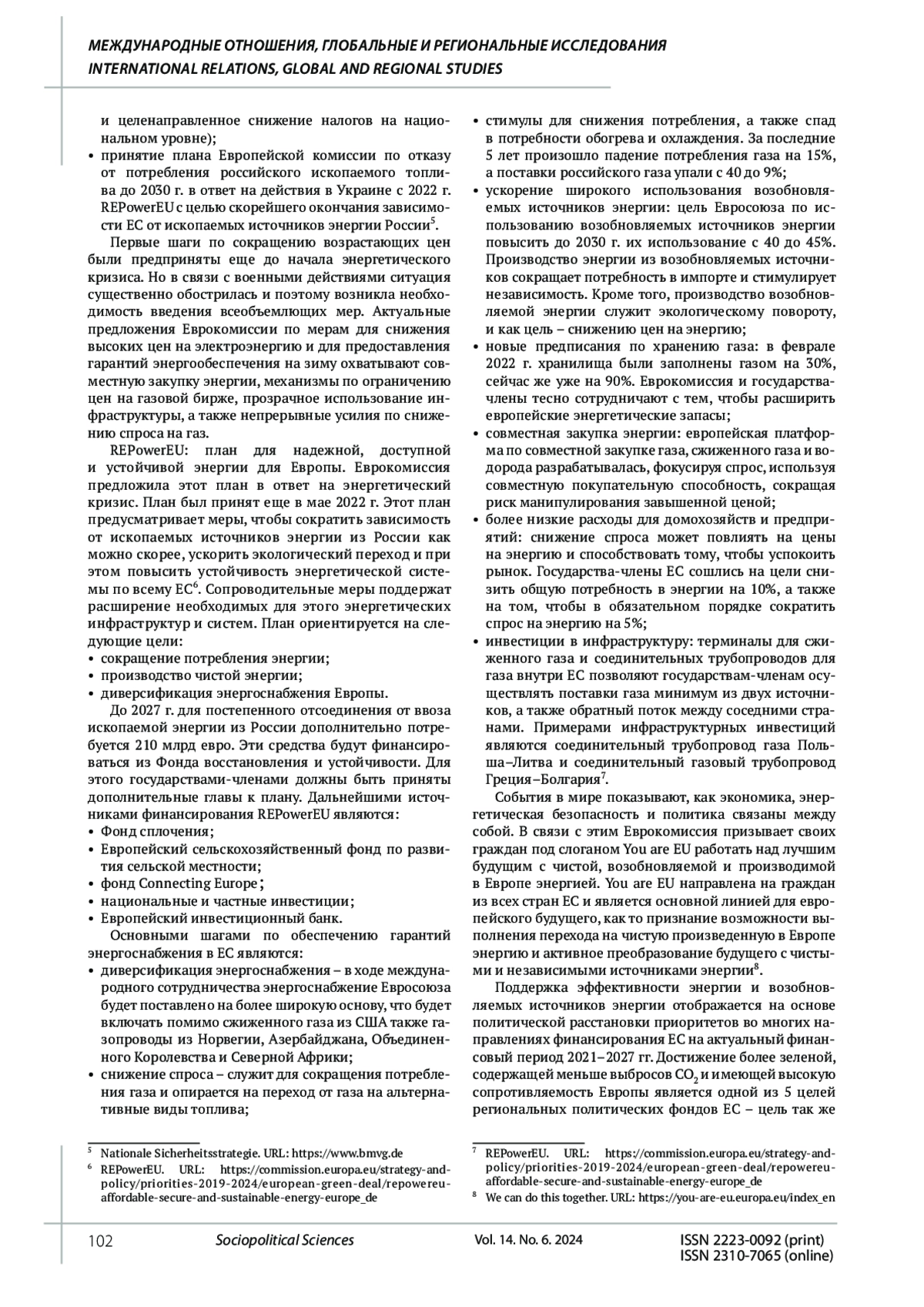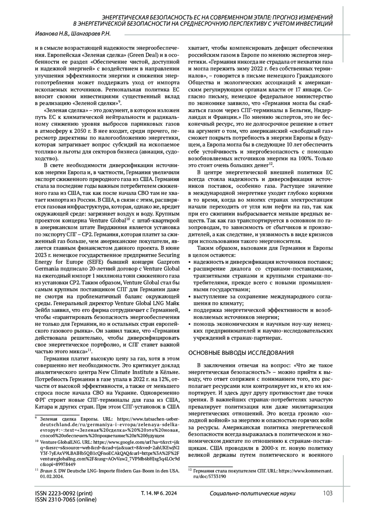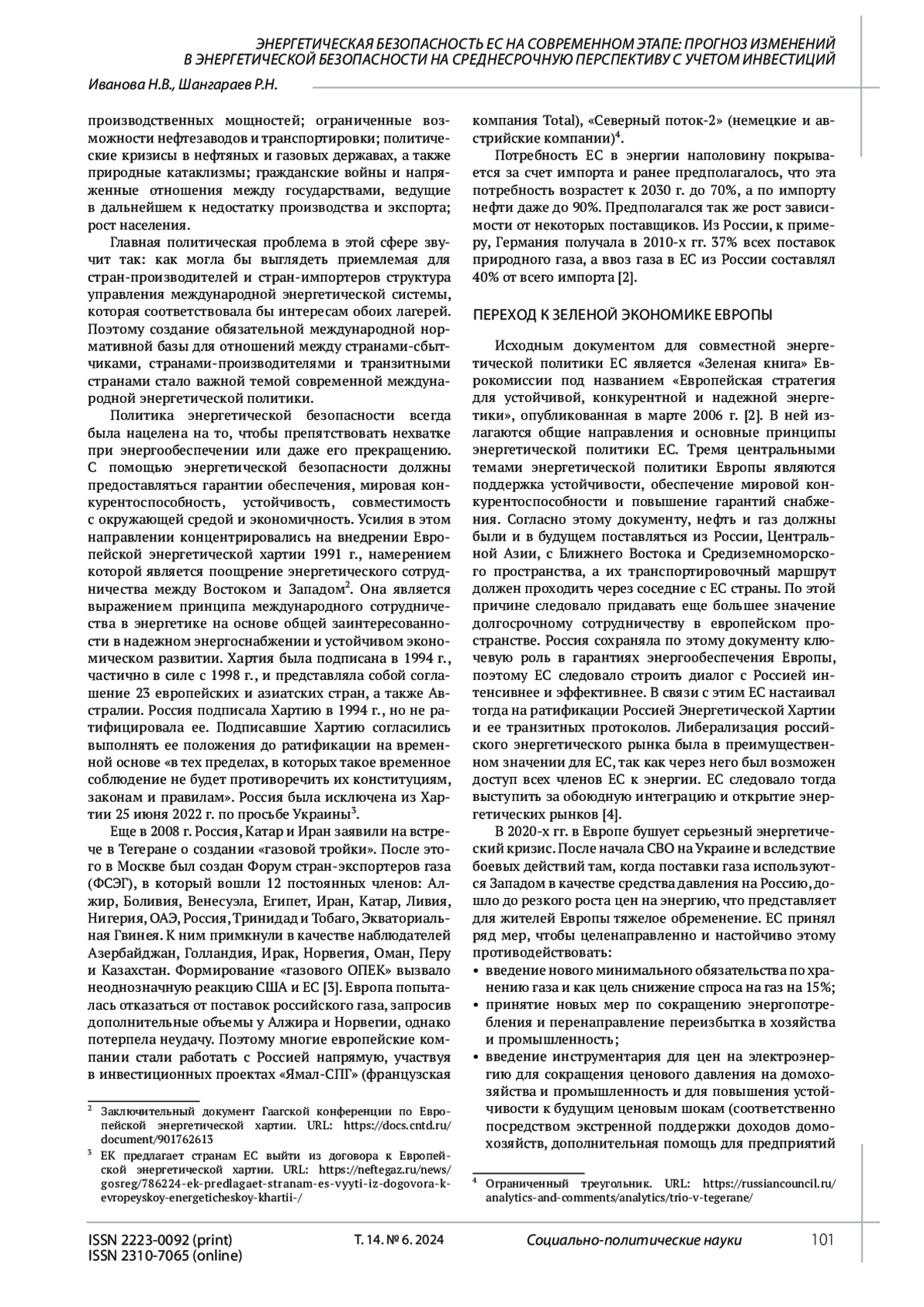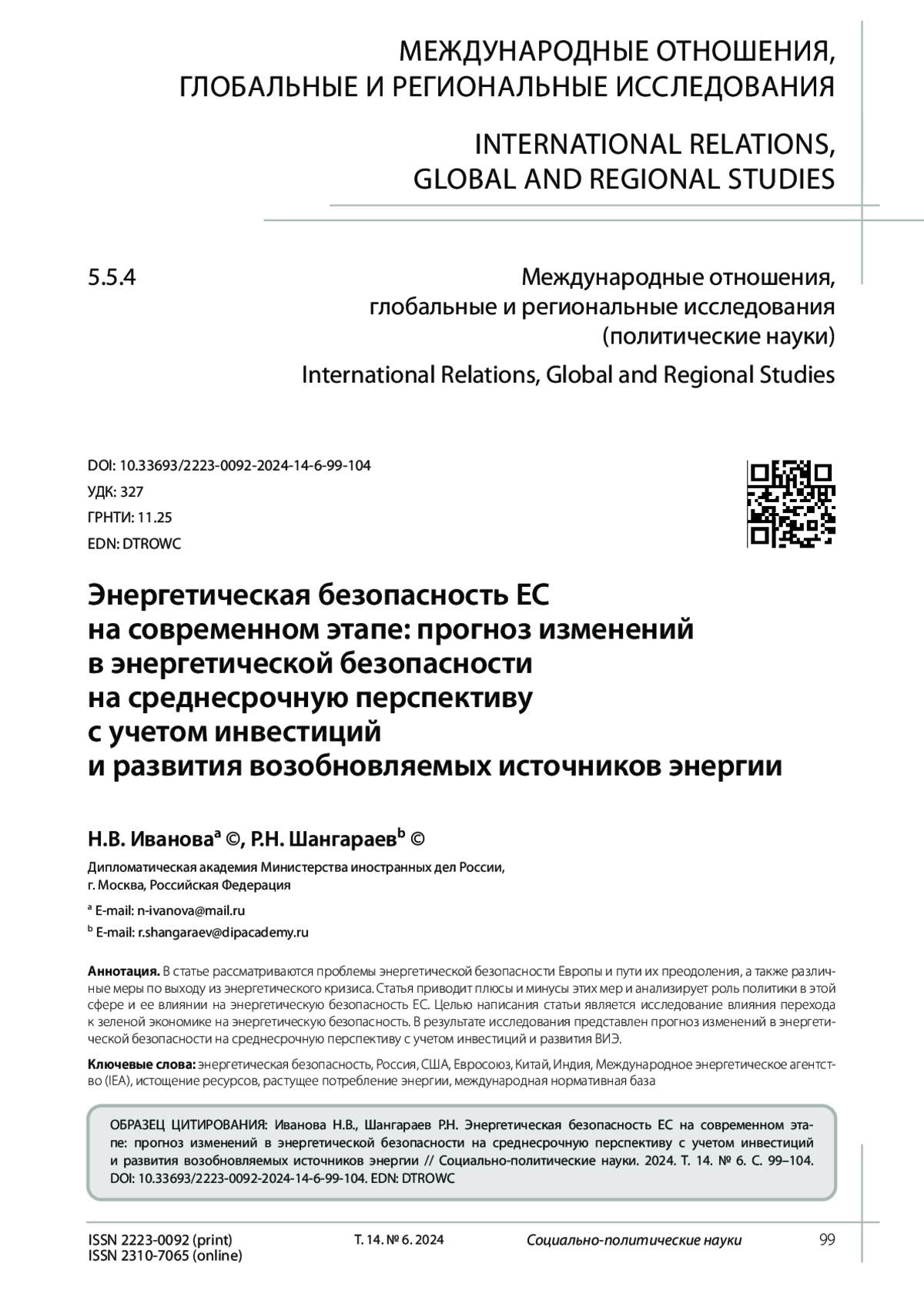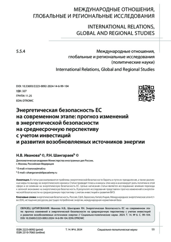 ИВАНОВА Н. В., ШАНГАРАЕВ Р. Н. ЭНЕРГЕТИЧЕСКАЯ БЕЗОПАСНОСТЬ ЕС НА СОВРЕМЕННОМ ЭТАПЕ: ПРОГНОЗ ИЗМЕНЕНИЙ В ЭНЕРГЕТИЧЕСКОЙ БЕЗОПАСНОСТИ НА СРЕДНЕСРОЧНУЮ ПЕРСПЕКТИВУ С УЧЕТОМ ИНВЕСТИЦИЙ И РАЗВИТИЯ ВОЗОБНОВЛЯЕМЫХ ИСТОЧНИКОВ ЭНЕРГИИ // СОЦИАЛЬНО-ПОЛИТИЧЕСКИЕ НАУКИ. 2024. Т. 14 № 6