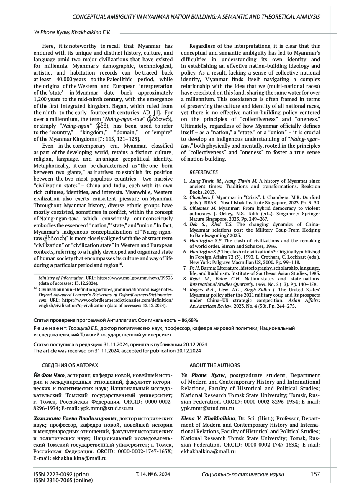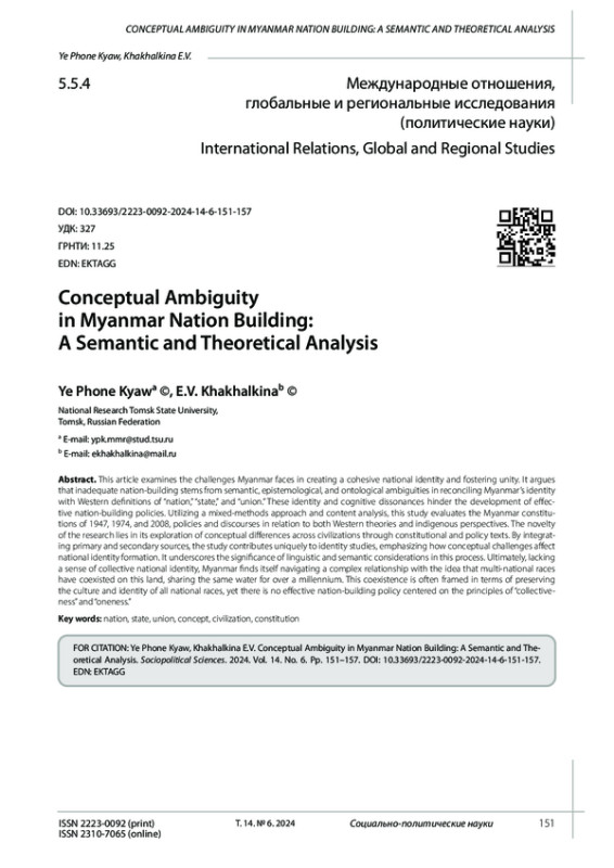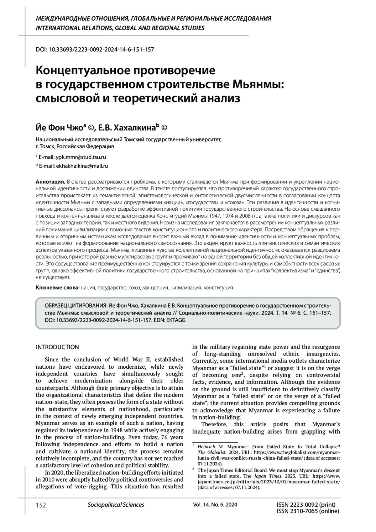 Статья: КОНЦЕПТУАЛЬНОЕ ПРОТИВОРЕЧИЕ В ГОСУДАРСТВЕННОМ СТРОИТЕЛЬСТВЕ МЬЯНМЫ: СМЫСЛОВОЙ И ТЕОРЕТИЧЕСКИЙ АНАЛИЗ (2024)