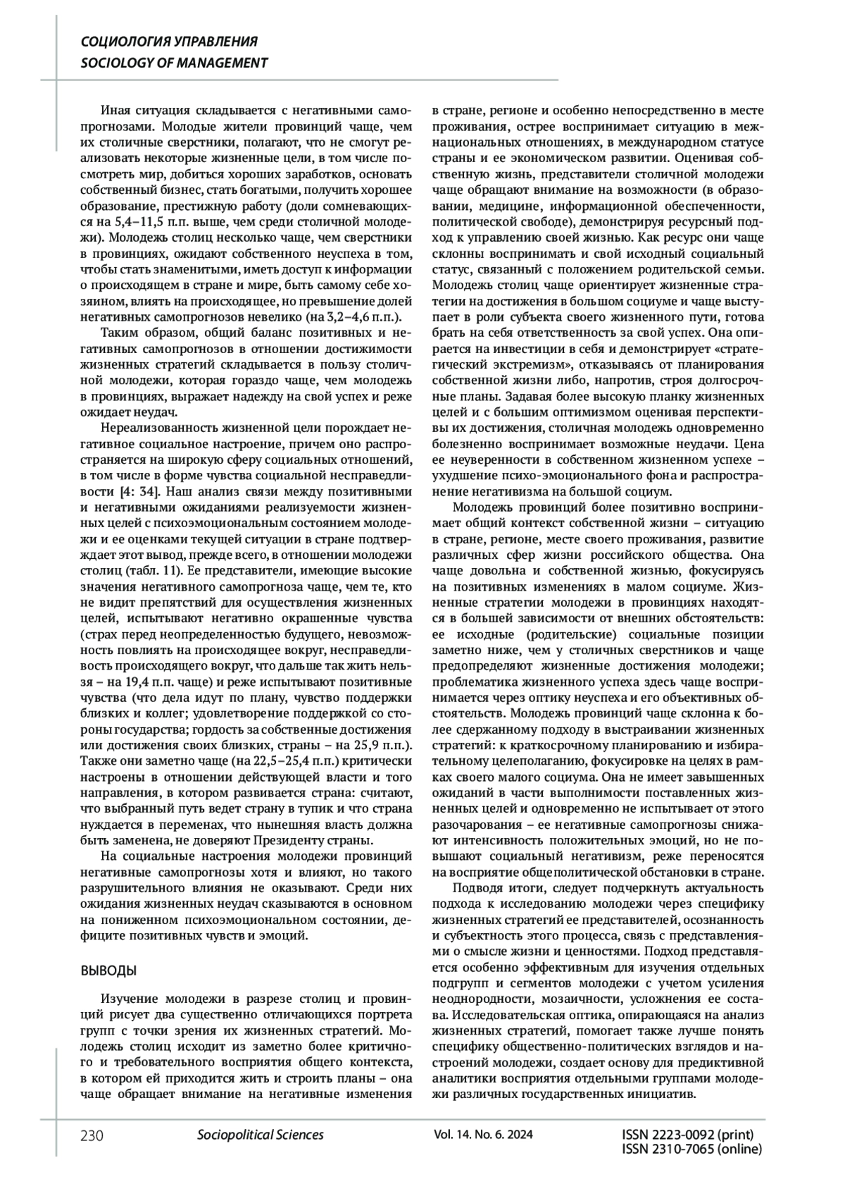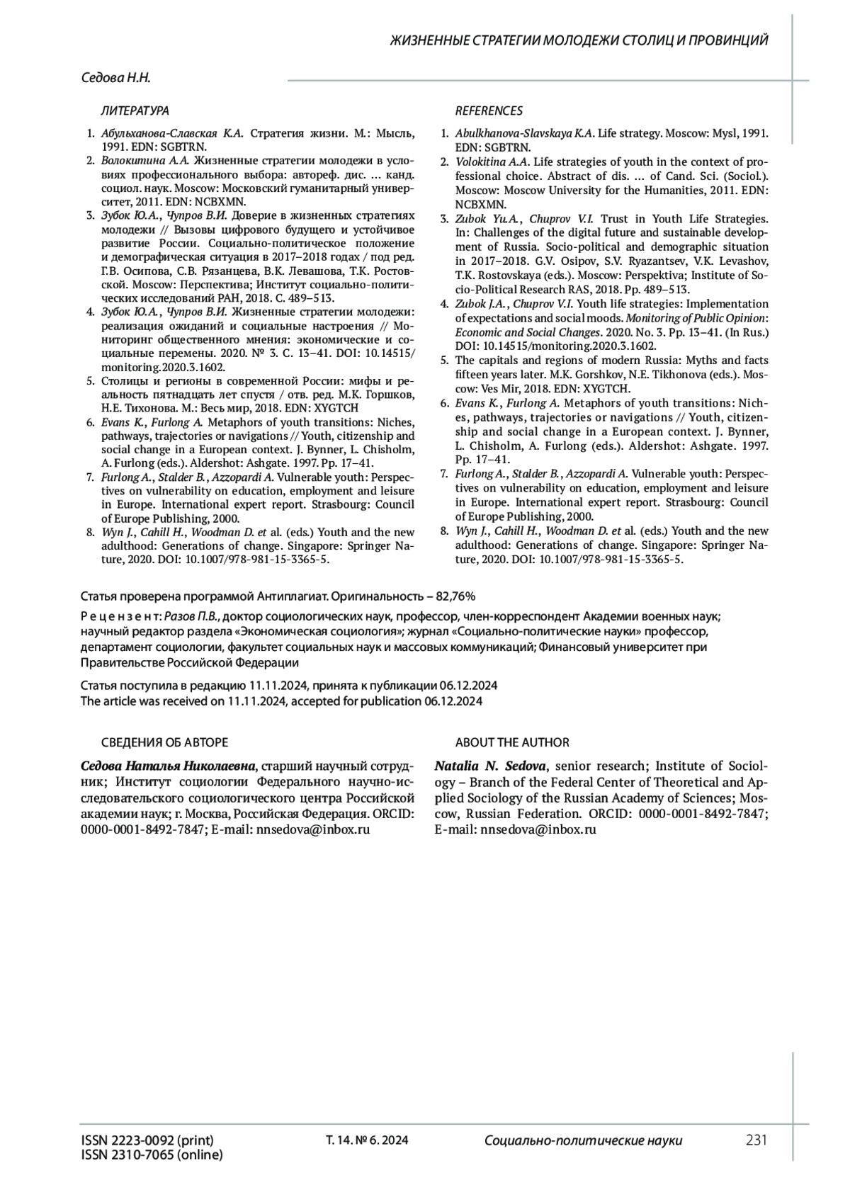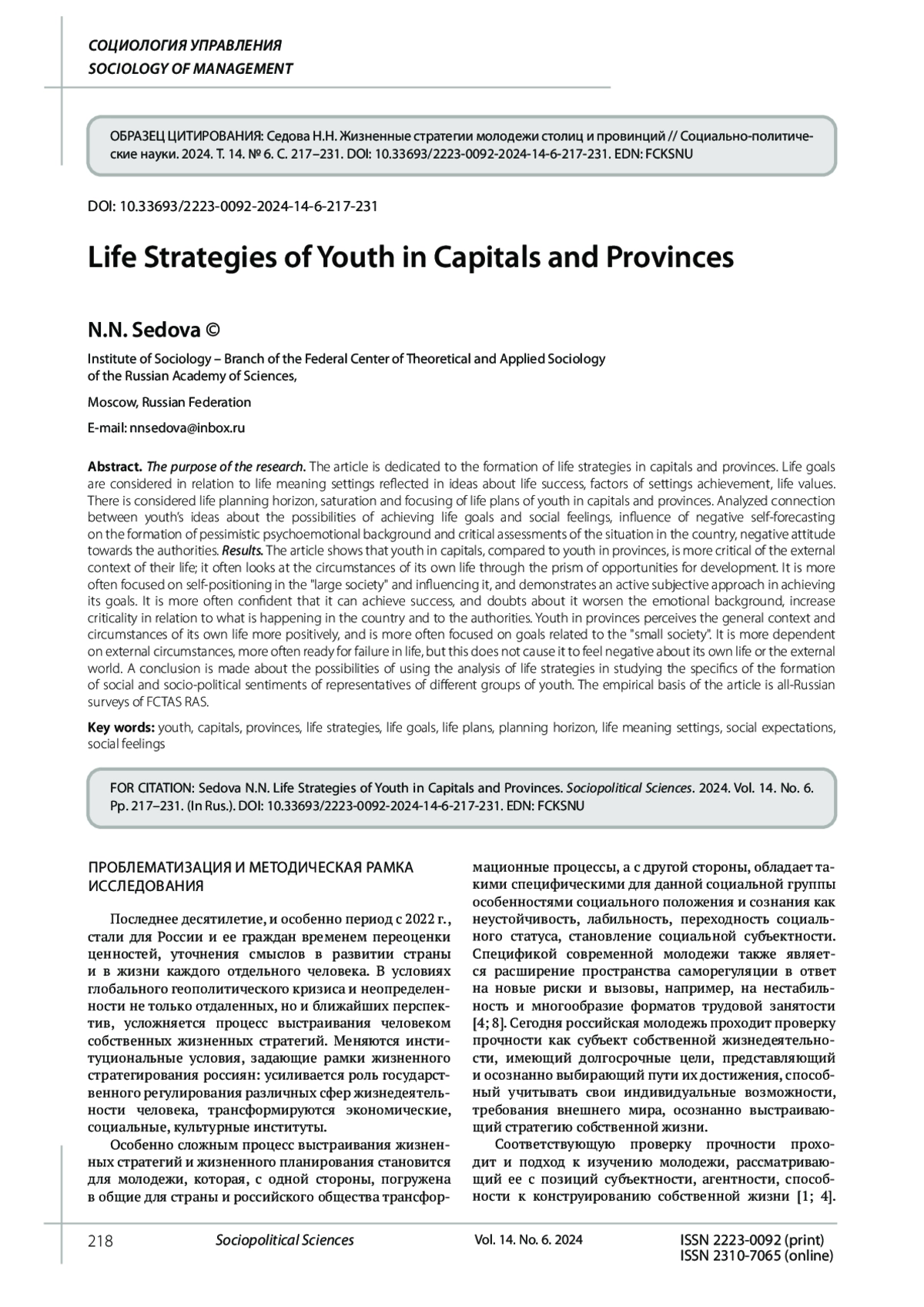 СЕДОВА Н. Н. ЖИЗНЕННЫЕ СТРАТЕГИИ МОЛОДЕЖИ СТОЛИЦ И ПРОВИНЦИЙ // СОЦИАЛЬНО-ПОЛИТИЧЕСКИЕ НАУКИ. 2024. Т. 14 № 6