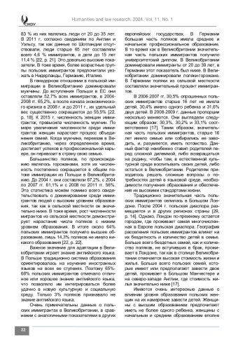 Анализ. Польская эмиграция в Великобританию становится важнейшим фактором, влияющим на жизнь обоих государств и на их взаимоотношения. В статье раскрывается социальная характеристика польских эмигрантов, проживающих в Великобритании. Автор уделяет внимание динамике численности польских эмигрантов и географии расселения их в Соединенном Королевстве, подчеркивая особую привлекательность Большого Лондона. Польские эмигранты первоначально, занимая малоквалифицированные должности, смогли достичь успехов на профессиональном поприще. Поэтому тезис о крайней зависимости польских эмигрантов от социальных пособий, культивируемый британскими националистами, не соответствует действительности. Среди эмигрантов доминировала молодежь, имеющая хороший уровень образования и владения английским языком. В тоже время нарастание численности эмигрантов из сельских районов ведет к увеличению доли эмигрантов, имеющих невысокий уровень образования. В гендерном отношении среди эмигрантов преобладали мужчины. Автор подробно в статье анализирует поведение семей польских эмигрантов в случае рождения детей и как этот факт отражается на ее благосостоянии.