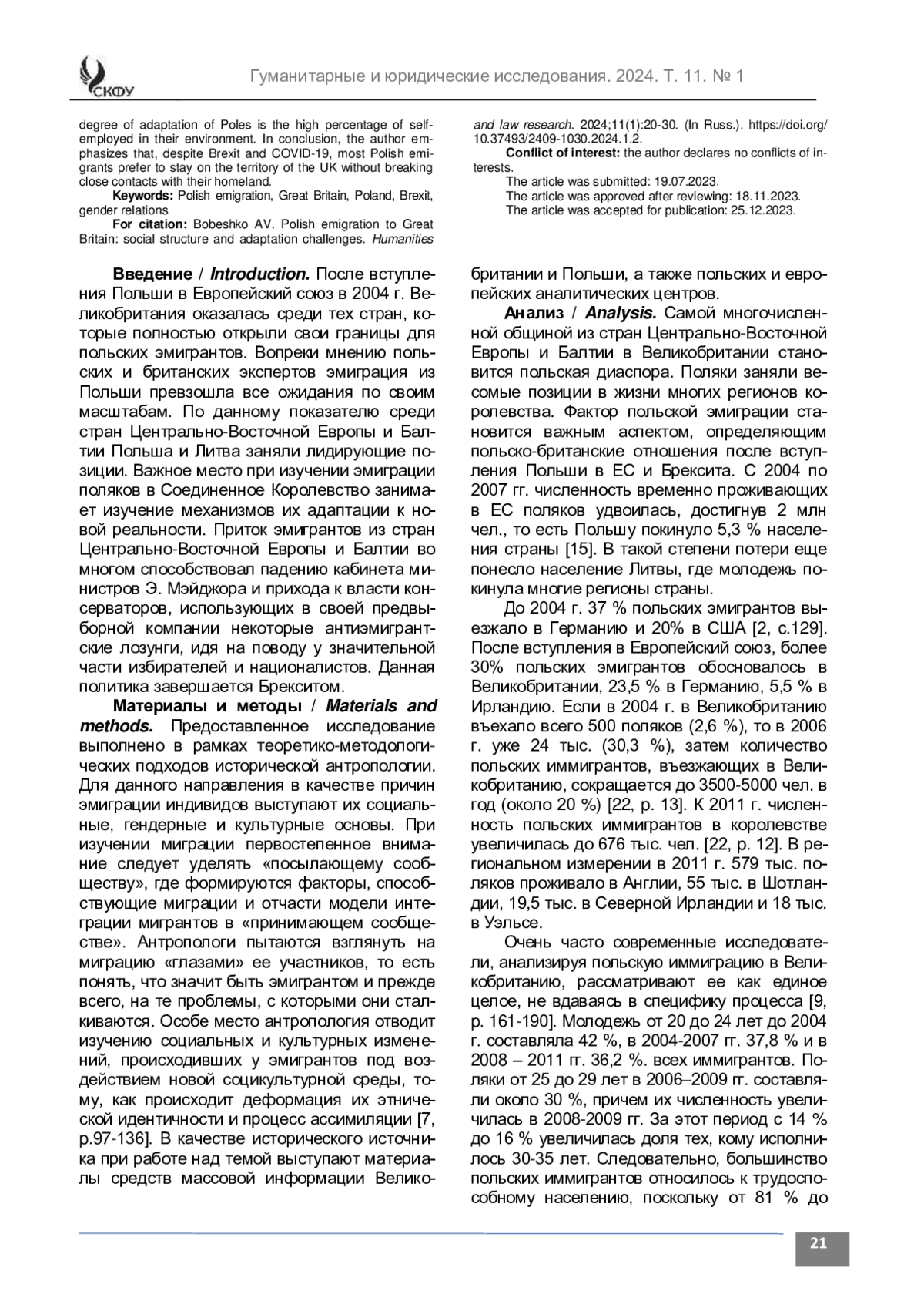 БОБЕШКО А. В. ПОЛЬСКАЯ ЭМИГРАЦИЯ В ВЕЛИКОБРИТАНИЮ: СОЦИАЛЬНАЯ СТРУКТУРА И ПРОБЛЕМЫ АДАПТАЦИИ // ГУМАНИТАРНЫЕ И ЮРИДИЧЕСКИЕ ИССЛЕДОВАНИЯ. 2024. ТОМ 11, № 1