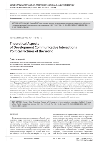Политическая картина мира, как высокоуровневый концепт, заключающий в себе понятийно-образные константы, выходит на первый план при анализе и интерпретации внешних и внутригосударственных событий политического, социально-экономического, технологического, экологического характера. Проблема заключается в том, что картины мира отличаются множественностью и проявляют себя в толковании одних и тех же политических событий и ситуаций с разных точек зрения. Мы можем свидетельствовать как столкновения, так и солидарные отношения между политическими картинами мира. Тем не менее, вопрос коммуникативных практик различных политических картин мира в пространственно-временной системе координат остается открытым. Целью статьи является анализ с позиций теории действия и теории коммуникативного действия моделей взаимодействий политических картин мира. Исследовательскими задачами выступают: обзор исторического процесса становления и генезиса концептов «картина мира» и «политическая картина мира», формирование системно-структурных элементов политических картин мира, сравнительный анализ моделей взаимодействия политических картин мира. Выводы. Политические картины мира проявляют себя в четырех видах действий: телеологическом (стратегическом), нормативно-регуляторном, драматургическом, коммуникативном. Представленные виды действий проявляются и выражаются в деятельности политических институтов. Рассмотренные виды или модели взаимодействий политических картин мира представляют собой компенсаторный механизм предотвращения конфликтов на бесчисленной арене картин мира.