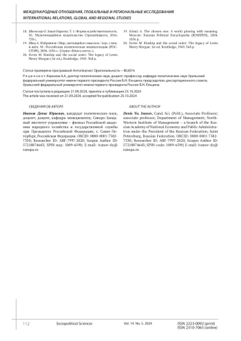 5. Лиханова Т.Ю. Состояние и трансформация структурных элементов российского национального самосознания // Социально-политические науки. 2024. Т. 14. № 4. С. 51-58. EDN: NZSPUR