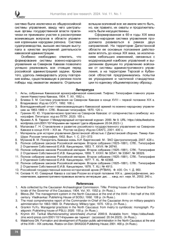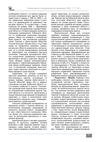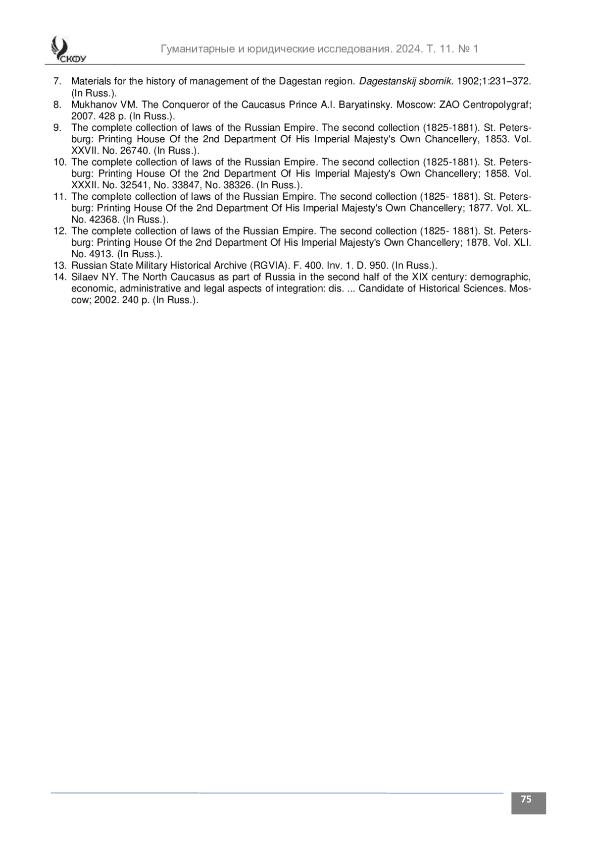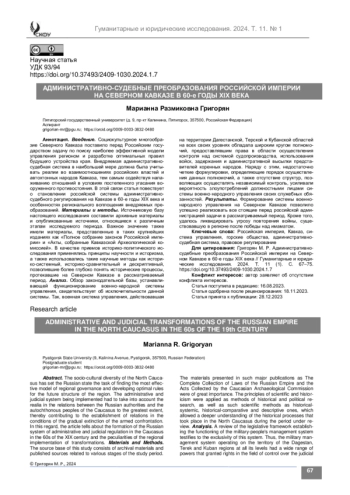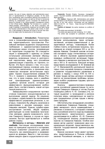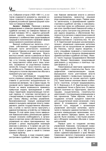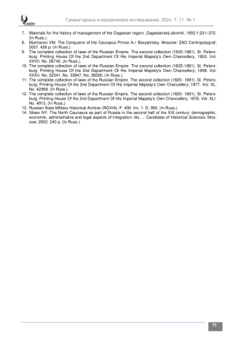 ГРИГОРЯН М. Р. АДМИНИСТРАТИВНО-СУДЕБНЫЕ ПРЕОБРАЗОВАНИЯ РОССИЙСКОЙ ИМПЕРИИ НА СЕВЕРНОМ КАВКАЗЕ В 60-Е ГОДЫ XIX ВЕКА // ГУМАНИТАРНЫЕ И ЮРИДИЧЕСКИЕ ИССЛЕДОВАНИЯ. 2024. ТОМ 11, № 1
