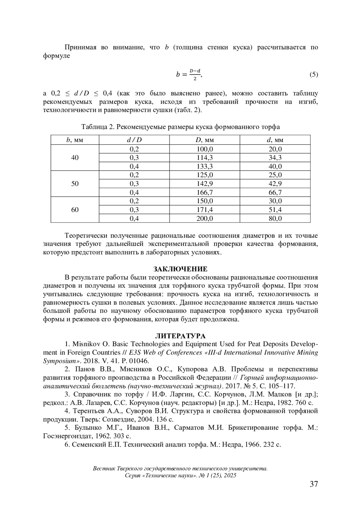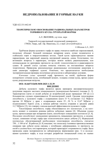 Статья: ТЕОРЕТИЧЕСКОЕ ОБОСНОВАНИЕ РАЦИОНАЛЬНЫХ ПАРАМЕТРОВ ТОРФЯНОГО КУСКА ТРУБЧАТОЙ ФОРМЫ (2025)