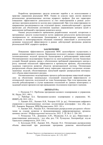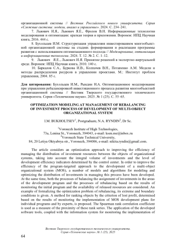 8. Бухольцев И.М. Структуризация управления инвестированием многообъектной организационной системы на стадиях формирования и реализации программы развития с использованием оптимизационного подхода // Моделирование, оптимизация и информационные технологии. 2024. Т. 12. № 2. C. 1-12. EDN: CVSLDV