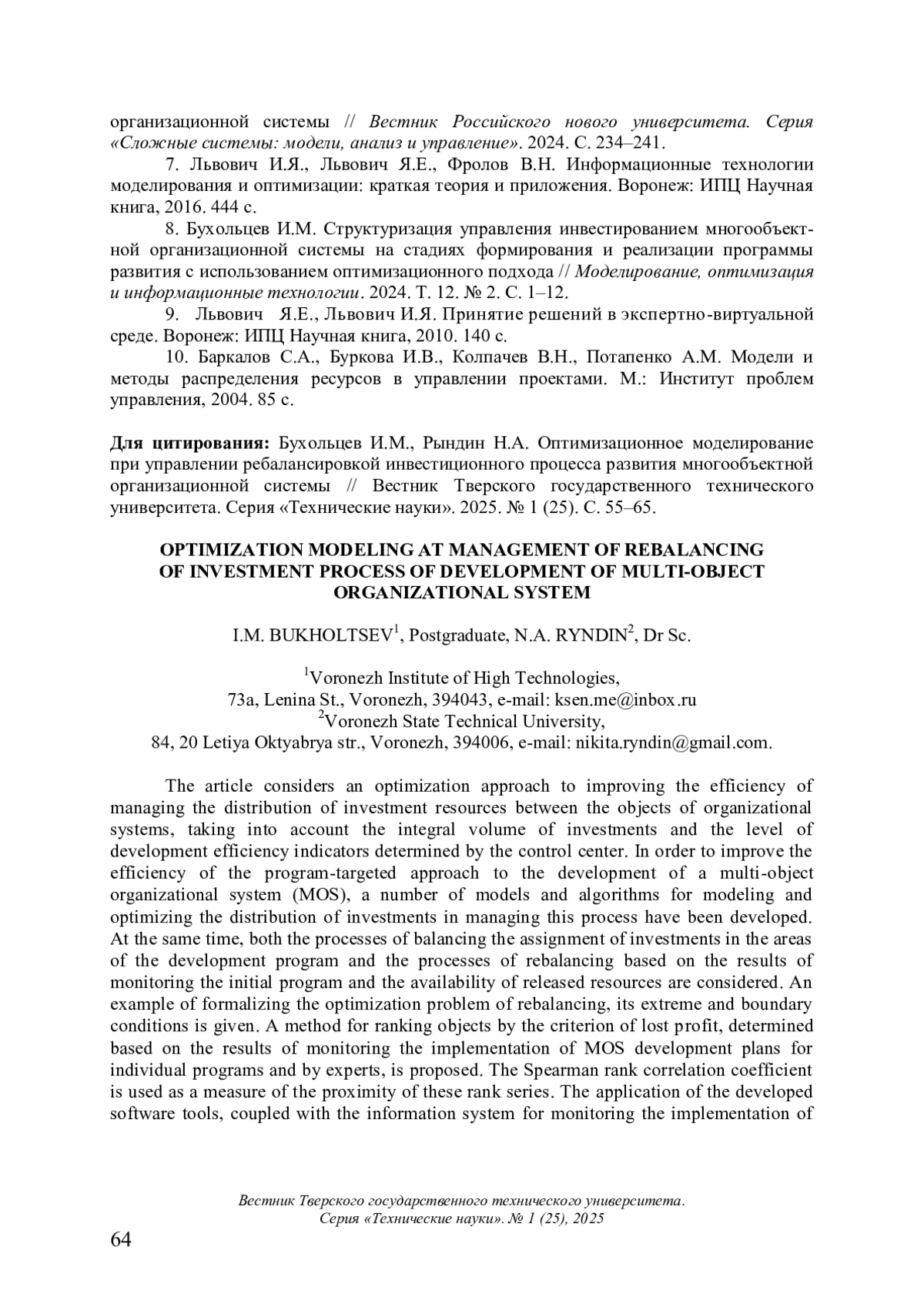 6. Бухольцев И.М., Львович Я.Е., Рындин Н.А. Оптимизация распределения объема инвестиций при реализации программы развития многообъектной организационной системы // Вестник Российского нового университета. Серия “Сложные системы: модели, анализ и управление”. 2024. С. 234-241. EDN: MYPASS