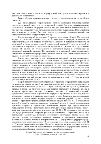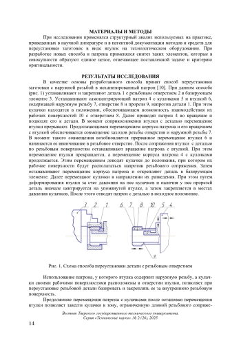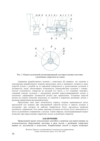 Представлен анализ известных способов и патронов для установки резьбовых деталей при обработке на токарных станках. Отмечена актуальность работы по созданию способа и средства для переустановки заготовки с резьбовым отверстием на двухшпиндельном токарном модуле. Изложена сущность разработанного способа, в котором при перестановке заготовки на контршпиндель станка в качестве базы используют резьбовое отверстие. Раскрыты устройство и принцип действия спроектированного кулачкового патрона с резьбовой упругой втулкой, сопряженной с корпусом патрона, что дает возможность осуществлять осевое перемещение. Приведены сравнительные анализы созданных способа и патрона с аналогичными известными решениями. Отражены оригинальность разработок и достигаемый технический результат
