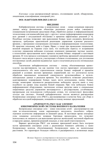 Современные возможности обнаружения противника, высокая мобильность боевых систем требуют немедленного принятия решений. Продемонстрирован один из способов решения этой проблемы – использование киберфизических систем в вооруженных силах. Показано, что основой подобных систем должны быть реагирующие беспроводные сенсорные сети (РБСС). Приведен вариант построения архитектуры РБСС для военных приложении с использованием сенсорных узлов с радиосвязью ближнего действия, а также беспроводных шлюзов, обеспечивающих беспроводную связь на большие расстояния. Разработан механизм обнаружения вторжения объекта в защищаемую зону с применением возможностей реагирующих беспроводных сенсорных сетей. Сделан вывод, что основой механизма обнаружения являются последовательности изображений (кадров), позволяющие определить значения, с помощью которых строятся модель сети, модель движения объектов, модель измерений и т. п.