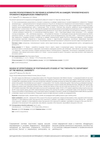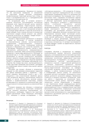 В статье проанализирована результативность обучения в аспирантуре на кафедре терапевтического профиля медицинского университета. Проведен анонимный опрос 11 аспирантов (6 мужчин и 5 женщин) в возрасте от 26 до 35 лет, обучавшихся по специальности «внутренние болезни» и «кардиология» в период с 2018 по 2024 г. Все аспиранты, которые закончили обучение в аспирантуре, успешно и в срок сдали государственную итоговую аттестацию, защитили научно-квалификационную работу и диссертацию. Ответ на вопрос «Насколько Вам интересно заниматься научно-исследовательской деятельностью?» соответствовал 10 (9; 10), «Насколько Вы оцениваете свое желание заниматься преподавательской деятельностью?» — 10 (9; 10) баллам. За желание продолжить заниматься научно-исследовательской деятельностью после защиты диссертации проголосовали все аспиранты. Сложности с набором материала отметили 55%, со статистической обработкой данных — 36%, с подготовкой раздела «обзор литературы» — 27%, «материал и методы исследования» — 18%, «собственные результаты» — 18% аспирантов. На вопрос, что необходимо улучшить при обучении в аспирантуре, 63,64% аспирантов ответили, что ничего улучшать не следует, 36,36% выбрали научно-исследовательскую подготовку, 9,09% — теоретическую подготовку на базе университета. Специфика обучения в аспирантуре на кафедре поликлинической терапии Института клинической медицины с использованием многосторонней подготовки специалистов в теоретическом, научном и педагогическом направлении способствует эффективной подготовке диссертационного исследования и ее защите в срок. Прослеживается высокая заинтересованность аспирантов в научной и педагогической деятельности.
