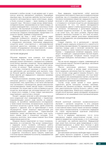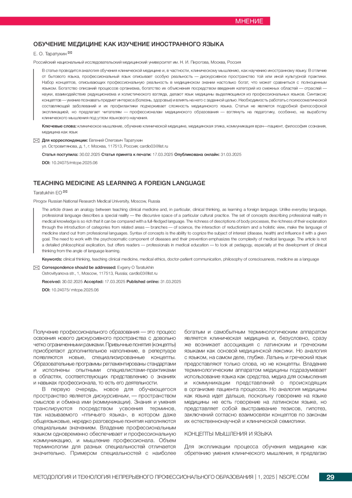 В статье проводится аналогия обучения клинической медицине и, в частности, клиническому мышлению, как научению иностранному языку. В отличие от бытового языка, профессиональный язык описывает особую реальность — дискурсивное пространство той или иной культурной практики. Набор концептов, описывающих профессиональную реальность в медицинском знании настолько богат, что может сравниться с полноценным языком. Богатство описаний процессов организма, богатство их объяснения посредством введения категорий из смежных областей — отраслей — науки, взаимодействие редукционизма и холистического взгляда, делают язык медицины выделяющимся из профессиональных языков. Синтаксис концептов — умение познавать предмет интереса (болезнь, здоровье) и влиять на него с заданной целью. Необходимость работать с психосоматической составляющей заболеваний и их профилактики подчеркивает сложность медицинского языка. Статья не является подробной философской экспликацией, но предлагает читателям — профессионалам медицинского образования — взглянуть на педагогику, особенно, на выработку клинического мышления под углом языкового научения.