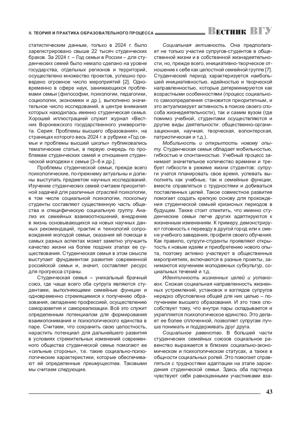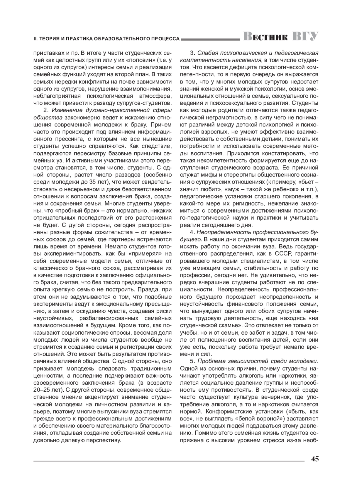 4. Ковтуненко Л. В. Представления студенческой молодежи о семье и семейных отношениях / Л. В. Ковтуненко // Вестник Воронежского государственного университета. Серия: Проблемы высшего образования. - 2024. - № 2. - С. 92-95. EDN: AVPUXX