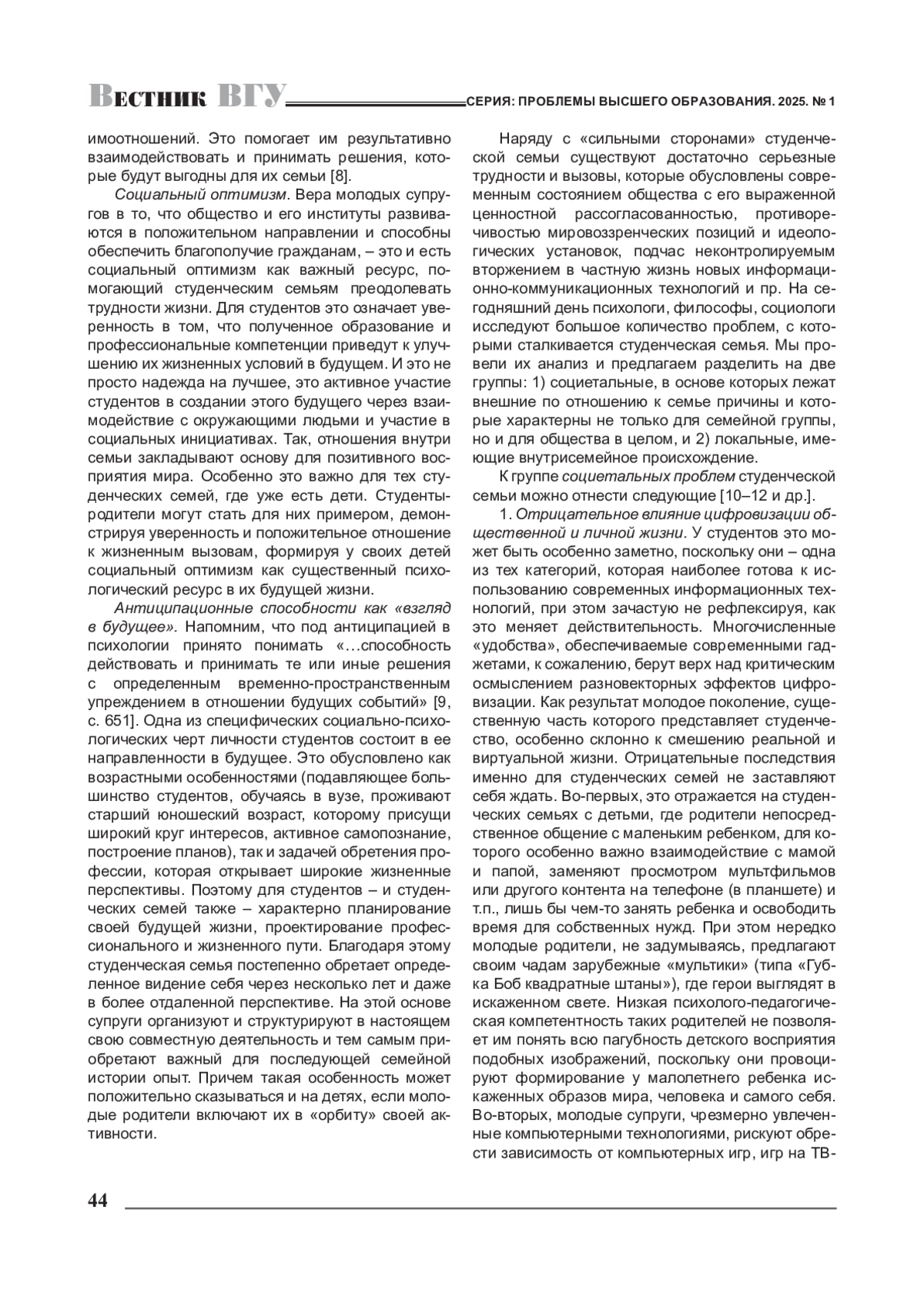 В статье анализируется актуальность социально-психологического исследования студенческих семей в современном российском обществе, поскольку они служат важным социальным ресурсом развития института семьи в России. Охарактеризованы такие «сильные стороны» студенческой семьи, позволяющие ей преодолевать вызовы современности, как: социальная активность, мобильность и открытость новому опыту, идентичность жизненных целей и установок молодых супругов, социальный оптимизм, социальное равенство, антиципационные способности как «взгляд в будущее». Вместе с тем обращается внимание на то, что студенческая семья сталкивается с социетальными (имеющими внешние источники и причины) и локальными (имеющими внутрисемейную природу) проблемами, что требует от нее определенного уровня социально-психологической зрелости, позволяющей находить конструктивные способы их преодоления.