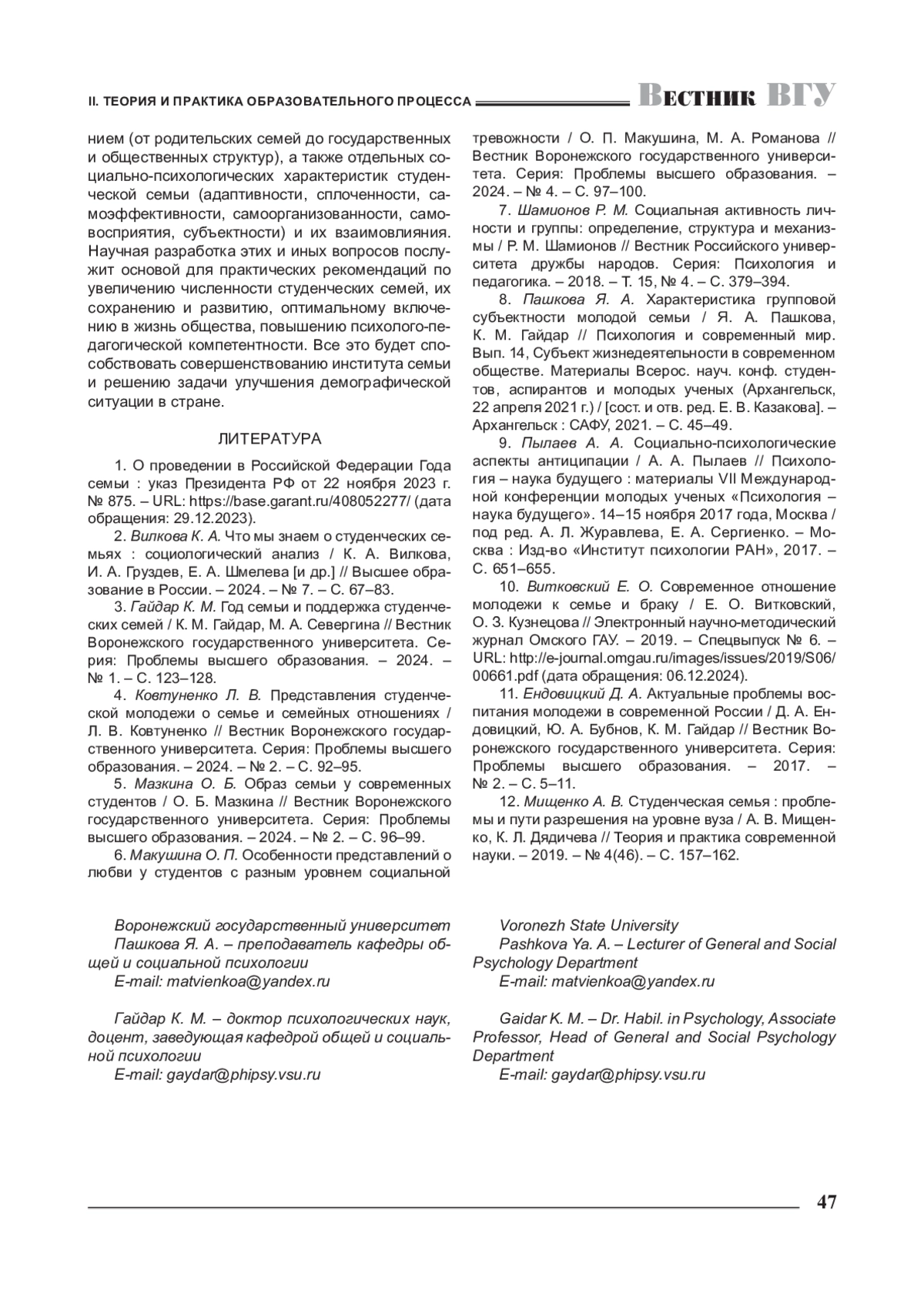 3. Гайдар К. М. Год семьи и поддержка студенческих семей / К. М. Гайдар, М. А. Севергина // Вестник Воронежского государственного университета. Серия: Проблемы высшего образования. - 2024. -№ 1.-С. 123-128. EDN: WWGUIW