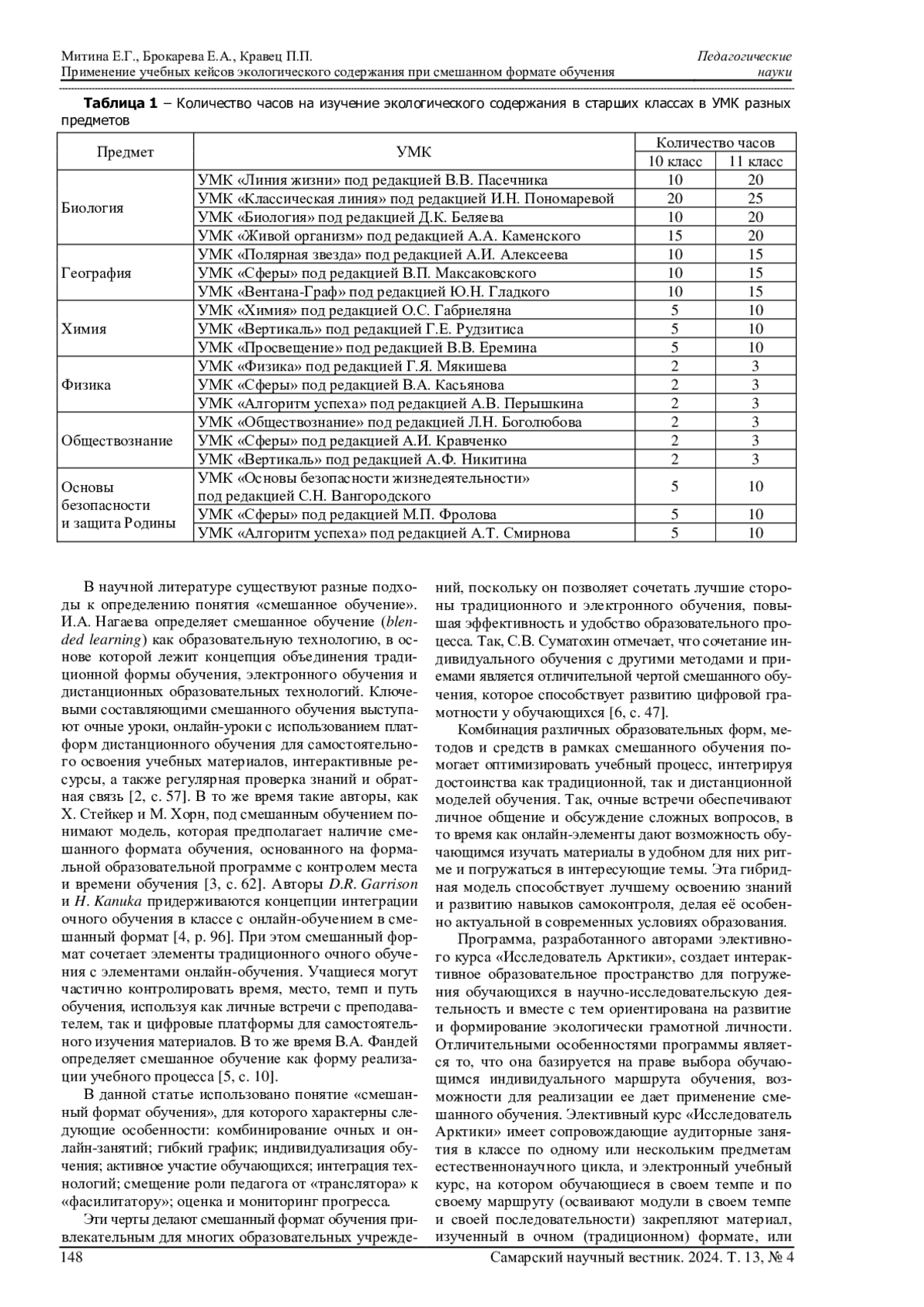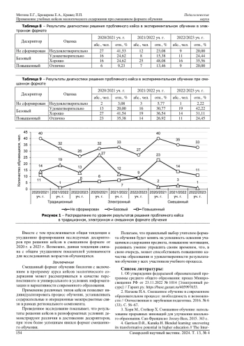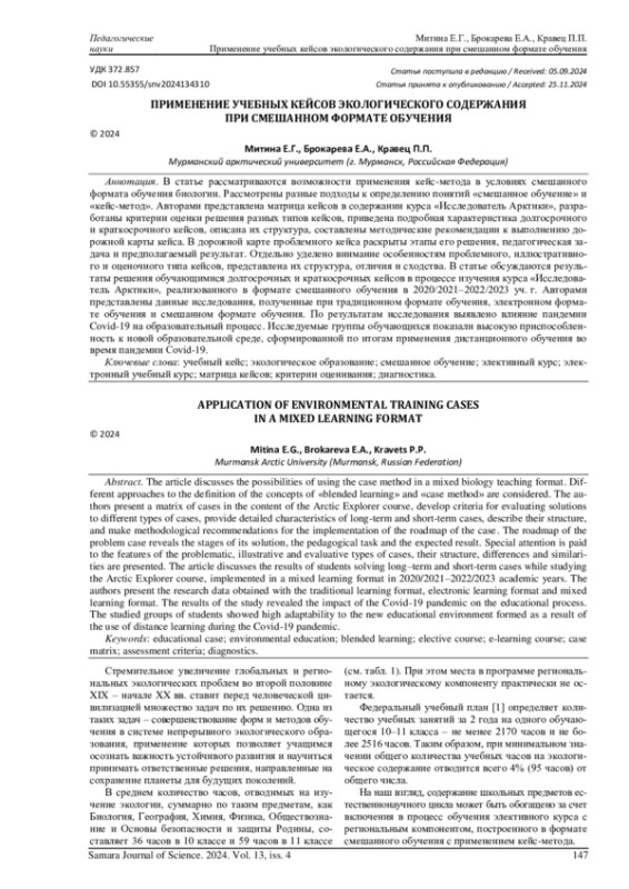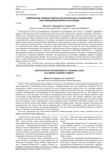 В статье рассматриваются возможности применения кейс-метода в условиях смешанного формата обучения биологии. Рассмотрены разные подходы к определению понятий «смешанное обучение» и «кейс-метод». Авторами представлена матрица кейсов в содержании курса «Исследователь Арктики», разработаны критерии оценки решения разных типов кейсов, приведена подробная характеристика долгосрочного и краткосрочного кейсов, описана их структура, составлены методические рекомендации к выполнению дорожной карты кейса. В дорожной карте проблемного кейса раскрыты этапы его решения, педагогическая задача и предполагаемый результат. Отдельно уделено внимание особенностям проблемного, иллюстративного и оценочного типа кейсов, представлена их структура, отличия и сходства. В статье обсуждаются результаты решения обучающимися долгосрочных и краткосрочных кейсов в процессе изучения курса «Исследователь Арктики», реализованного в формате смешанного обучения в 2020/2021-2022/2023 уч. г. Авторами представлены данные исследования, полученные при традиционном формате обучения, электронном формате обучения и смешанном формате обучения. По результатам исследования выявлено влияние пандемии Covid-19 на образовательный процесс. Исследуемые группы обучающихся показали высокую приспособленность к новой образовательной среде, сформированной по итогам применения дистанционного обучения во время пандемии Covid-19.