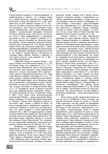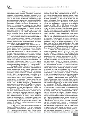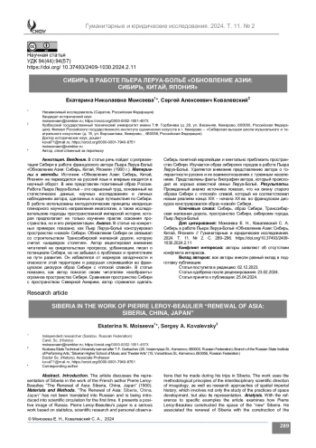 Анализ. В статье на конкретных примерах показано, как Пьер Леруа-Больё конструировал пространство «новой» Сибири. Обновление Сибири он связывал со строительством Транссибирской железной дороги, которую считал «шедевром столетия». Автор акцентировал внимание читателей на свидетельствах прогресса, урбанизации, писал о потенциале Сибири, но не забывал о проблемах и препятствиях на пути развития. Он избавлялся от маркеров загадочности и опасности этой территории и разрушал сложившийся во французском дискурсе образ Сибири с «плохой славой». В статье показано, как автор помогал своим читателям «вообразить» огромное пространство Сибири. Сравнивая пространство Сибири с пространством Северной Америки, автор стремился сделать Сибирь понятной европейцам и ментально приблизить пространство Сибири. Изучается образ сибирских городов в работе Пьера Леруа-Больё. Уделяется внимание представлению автора о толерантности русских и их взаимоотношениях с туземным населением. Представлены факты биографии автора, который происходил из хорошо известной семьи Леруа-Больё.
