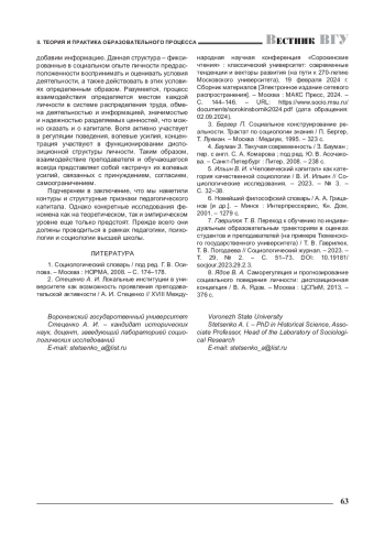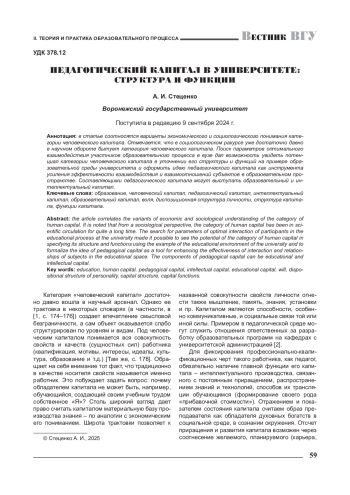 СТЕЦЕНКО А. И. ПЕДАГОГИЧЕСКИЙ КАПИТАЛ В УНИВЕРСИТЕТЕ: СТРУКТУРА И ФУНКЦИИ // ВЕСТНИК ВОРОНЕЖСКОГО ГОСУДАРСТВЕННОГО УНИВЕРСИТЕТА. СЕРИЯ: ПРОБЛЕМЫ ВЫСШЕГО ОБРАЗОВАНИЯ. 2025. № 1
