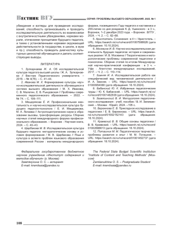 1. Зулкарнаева Ж. А. Об исследовательской культуре педагога высшей школы / Ж. А. Зулкарнаева // Вестник Педагогического университета. -2018. -№ 4(76). - С. 41-44. EDN: QTIURF