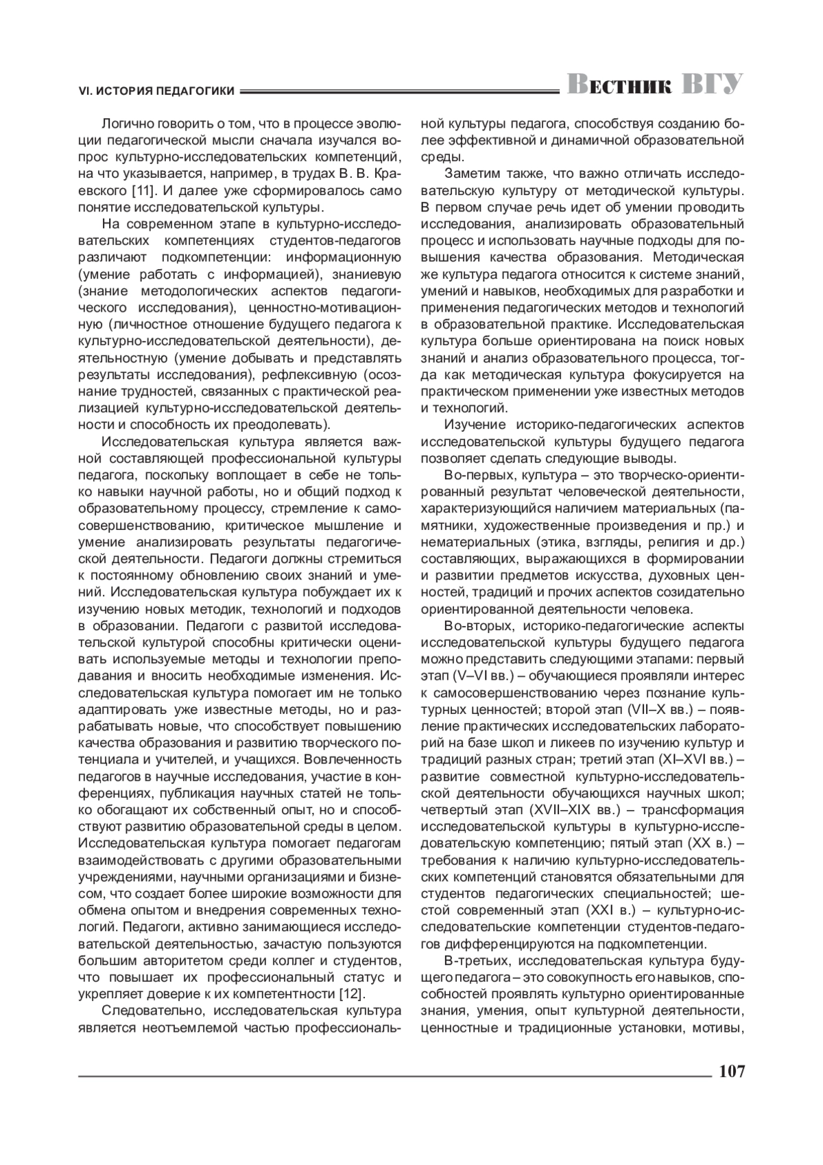 Статья посвящена исследованию ключевых исторических аспектов становления и развития такого важного в педагогической науке понятия, как «исследовательская культура будущего педагога». Выделены шесть этапов развития данного феномена педагогической мысли. По результатам историко-теоретического анализа делается вывод о сути и содержании термина «культура», формулируется авторское определение понятия «исследовательская культура будущего педагога».