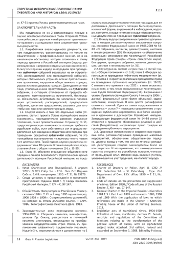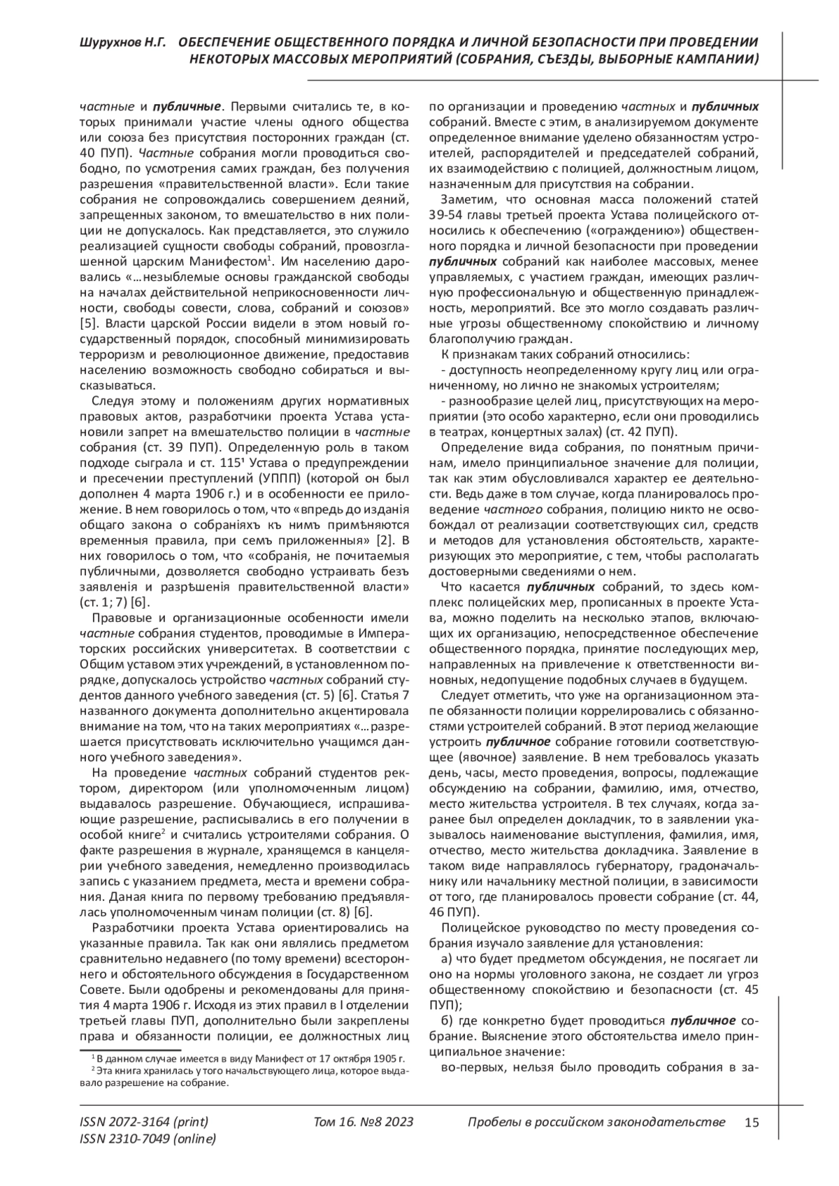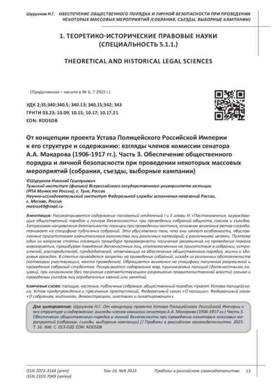 14. Шурухнова Д.Н., Шурухнов Н.Г. От концепции проекта Устава полицейского Российской империи к его структуре и содержанию: взгляды членов Комиссии Сенатора А.А. Макарова и их значение для формирования правовых актов, совершенствования полиции Российской Федерации. Часть 1. Сущность полицейских обязанностей, главная цель и пределы деятельности полиции Российской империи по проекту Устава полицейского // Пробелы в российском законодательстве. - 2023. - Т. 16.- № 6. - С. 13-20. EDN: WLSSUU