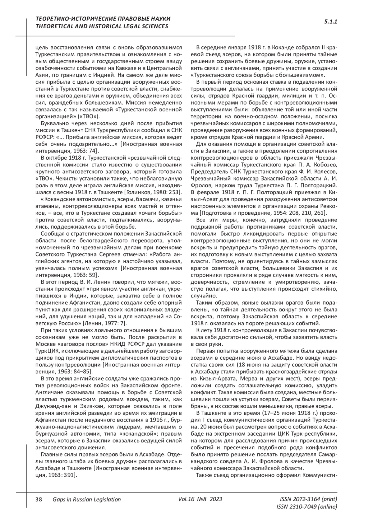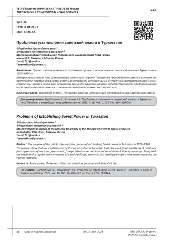 Целью статьи является исследование процесса установления советской власти в Туркестане в 1917-1924 гг. Авторы показывают, что установление советского строя в Туркестане происходило в сложных условиях сопротивления противников новой власти, иностранной интервенции и внутренних контрреволюционных выступлений. Наряду с созданием регулярной армии для защиты молодой государственности предпринимались меры социально-политического, экономического и идеологического характера.