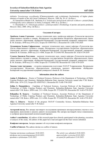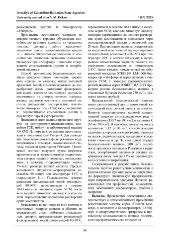 Обоснование использования ремонтантных сортов малины в производстве продуктов специализированного назначения требует исследования содержания в них биологически активных компонентов применительно к почвенно-климатическим условиям произрастания культуры. Целью работы являлось определение антиоксидантного потенциала ягод ремонтантной малины сорта «Поклон Казакову», выращенной в Кабардино-Балкарской Республике, и разработка технологии безалкогольного напитка диетического профилактического назначения. В работе использовались общепринятые и специальные физико-химические и биохимические методы исследования. Установлено, что ягоды ремонтантной малины сорта «Поклон Казакову» содержат комплекс водо и жирорастворимых витаминов, в том числе антиоксидантов. Степень удовлетворения потребности организма человека при потреблении 100 г ягод малины покрывается в витамине С на 30,2-100,7%; в фолатах и в витамине К - в 1,7-4,6 и 3,0-12,0 раза больше суточной нормы соответственно. Содержание Р-активных соединений в ягодах малины сорта «Поклон Казакову» составило 552,7 мг/100 г. На основании результатов исследования разработана технология производства безалкогольного напитка диетического профилактического назначения с использованием пюре из ремонтантной малины сорта «Поклон Казакову», пектинового экстракта из створок зеленого горошка, сахарозаменителя эритрита и биокорректора «Абифлор». Показано, что новый напиток характеризуется высокой концентрацией веществ антиоксидантного ряда - полифенолов (330,7 мг/100 см3) и витамина С (16 мг/100 см3). В нем обнаружены пектины в количестве 1,12 г/100 см3. 200 см3 разработанного напитка покрывает потребность организма человека в Р-активных веществах, аскорбиновой кислоте и пектине более чем на 15% от рекомендуемого суточного потребления.