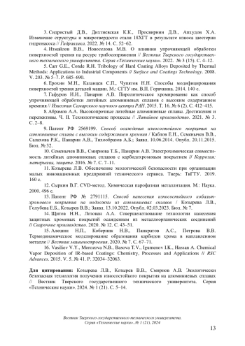 14. Щитов Н.Н., Лозован А.А. Совершенствование технологии нанесения защитных хромовых покрытий осаждением из металлоорганических соединений // Сварочное производство. 2020. № 12. С. 43-51. EDN: KQEEMP