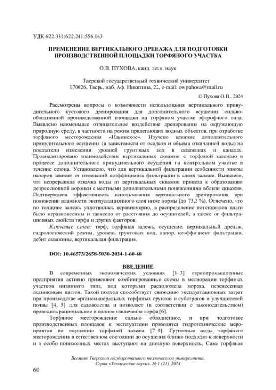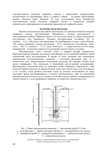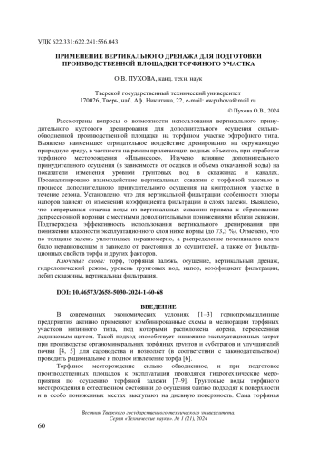 Рассмотрены вопросы о возможности использования вертикального принудительного кустового дренирования для дополнительного осушения сильнообводненной производственной площадки на торфяном участке эфтрофного типа. Выявлено наименьшее отрицательное воздействие дренирования на окружающую природную среду, в частности на режим прилегающих водных объектов, при отработке торфяного месторождения «Ильинское». Изучено влияние дополнительного принудительного осушения (в зависимости от осадков и объема откачанной воды) на показатели изменения уровней грунтовых вод в скважинах и каналах. Проанализировано взаимодействие вертикальных скважин с торфяной залежью в процессе дополнительного принудительного осушения на контрольном участке в течение сезона. Установлено, что для вертикальной фильтрации особенности эпюры напоров зависят от изменений коэффициента фильтрации в слоях залежи. Выявлено, что непрерывная откачка воды из вертикальных скважин привела к образованию депрессионной воронки с местными дополнительными понижениями вблизи скважин. Подтверждена эффективность использования вертикального дренирования при понижении влажности эксплуатационного слоя ниже нормы (до 73,3 %). Отмечено, что по толщине залежь уплотнилась неравномерно, а распределение потенциалов влаги было неравновесным и зависело от расстояния до осушителей, а также от фильтрационных свойств торфа и других факторов