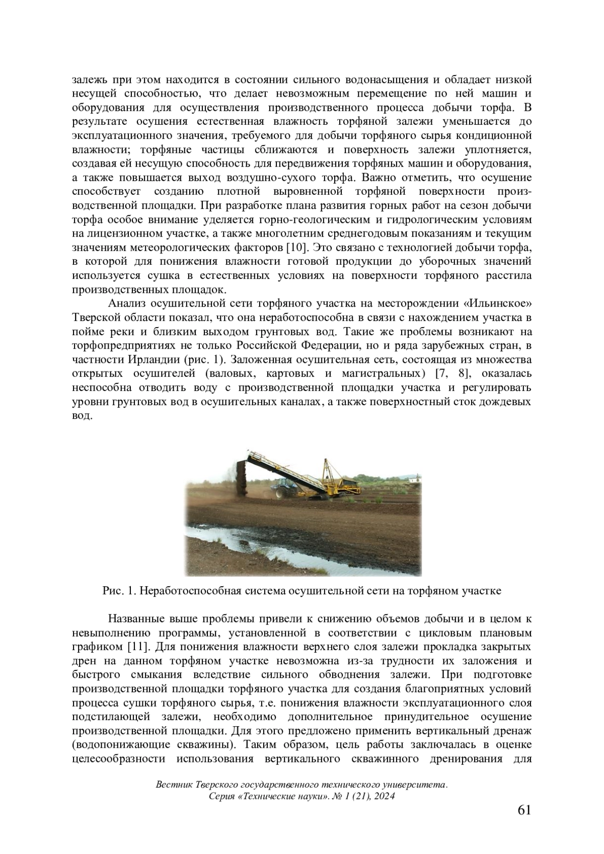 В современных экономических условиях [1–3] горнопромышленные предприятия активно применяют комбинированные схемы в мелиорации торфяных участков низинного типа, под которыми расположена морена, перенесенная ледниковым щитом. Такой подход способствует снижению эксплуатационных затрат при производстве органоминеральных торфяных грунтов и субстратов и улучшителей почвы [4, 5] для садоводства и позволяет (в соответствии с законодательством) проводить рациональное и полное извлечение торфа